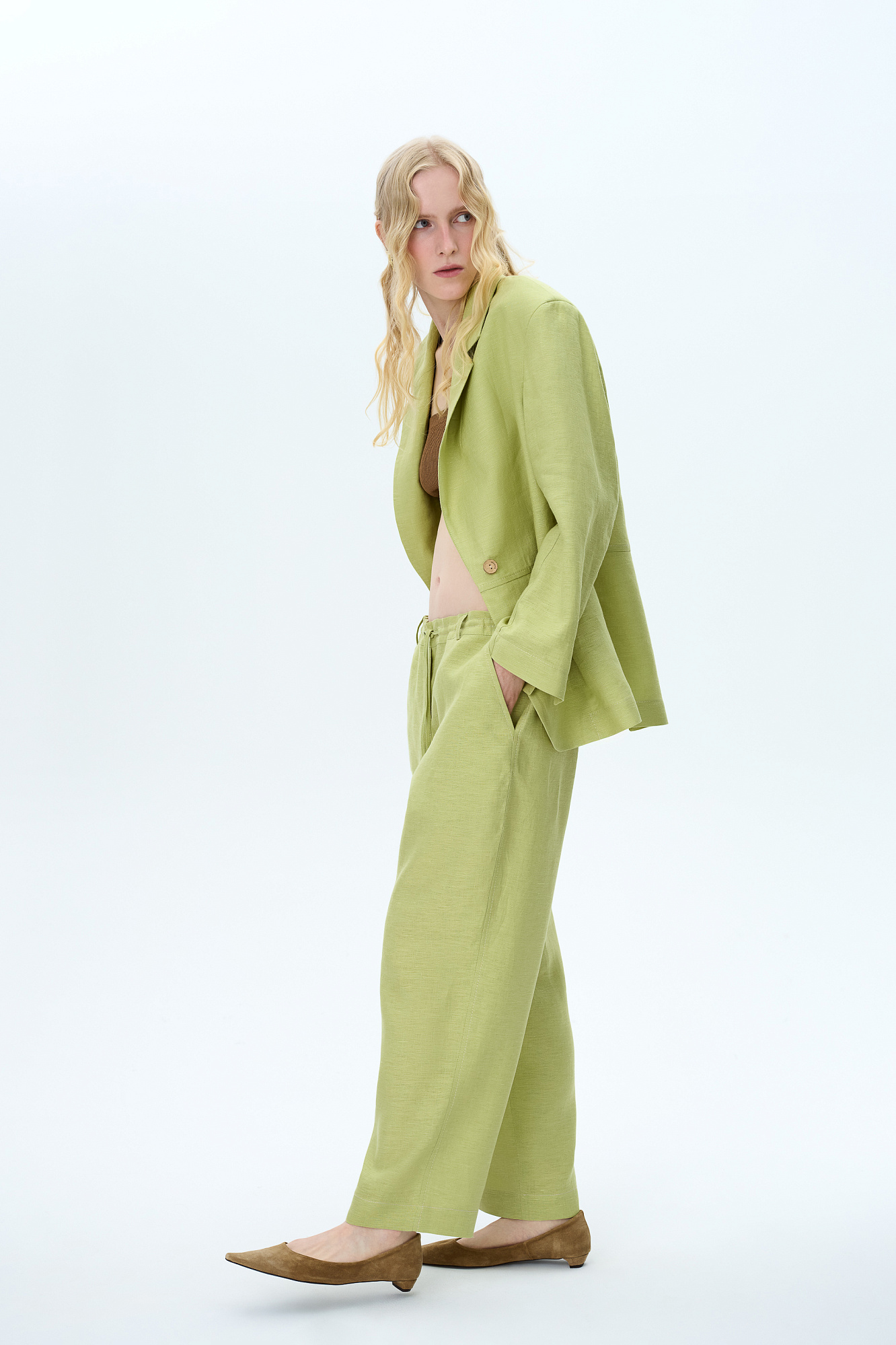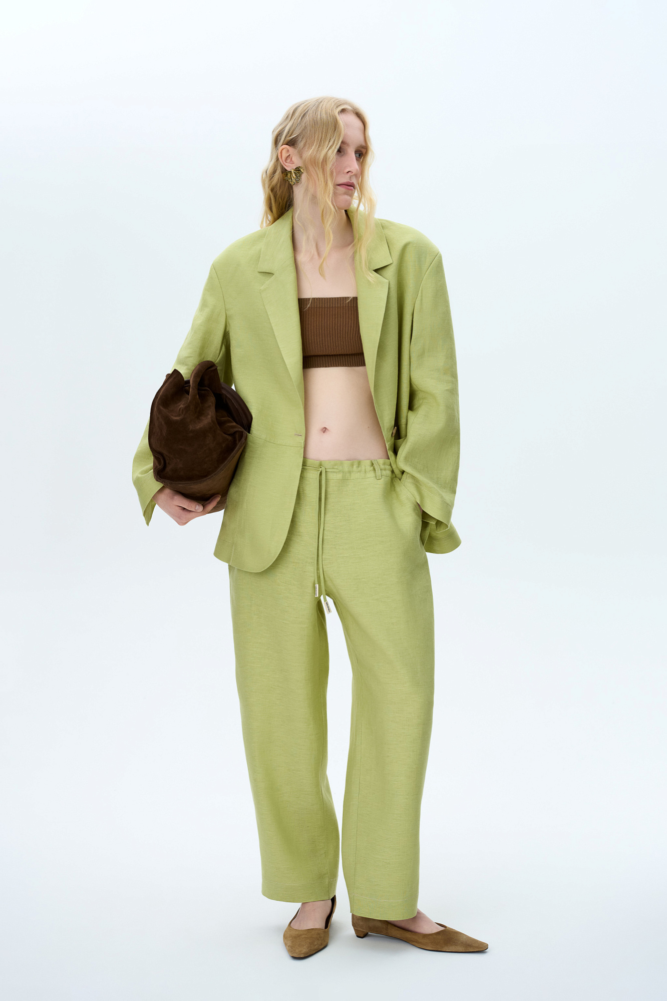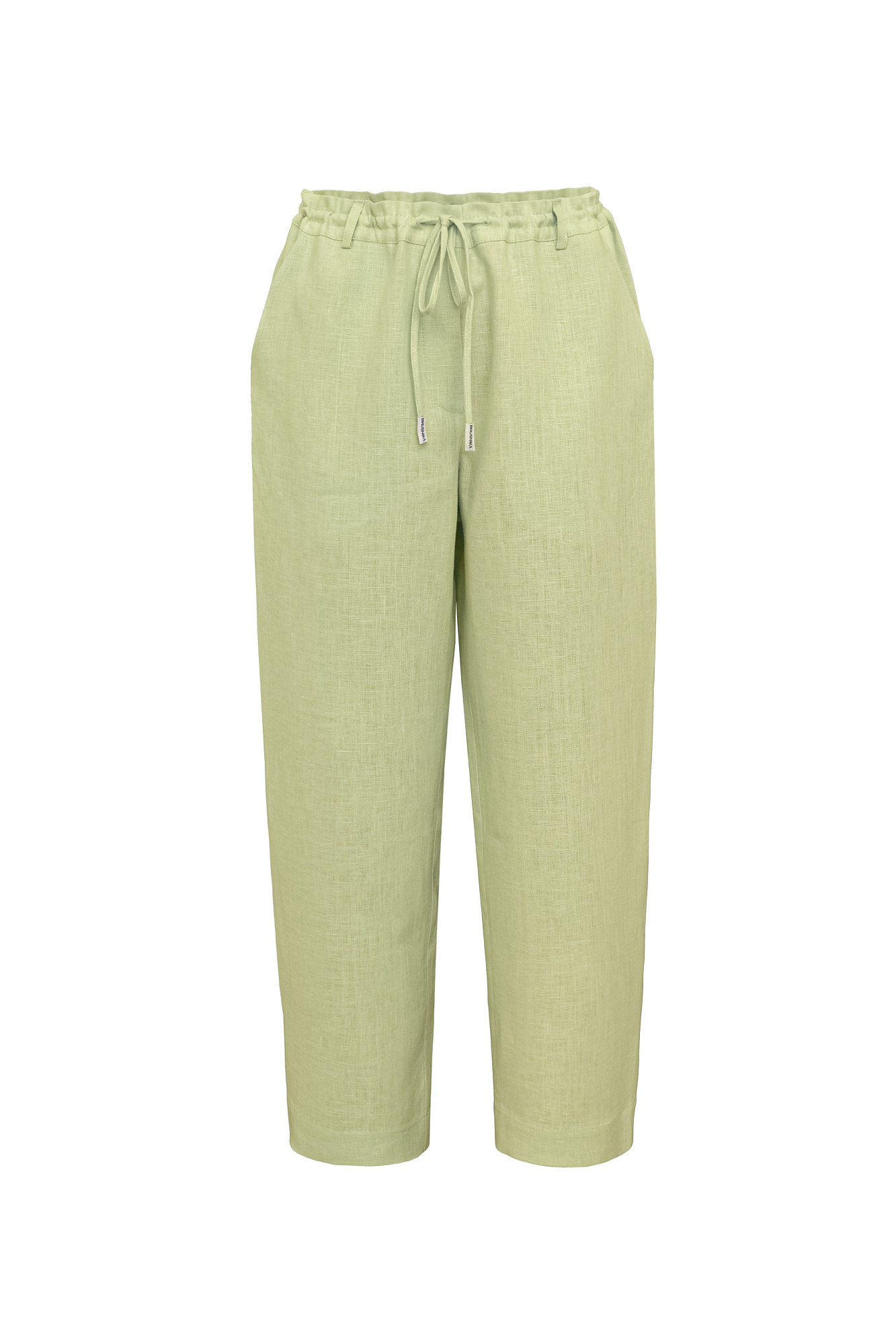 Брюки-бананы из 100% льна. Модель свободного силуэта с эластичным поясом на кулиске и боковыми карманами. Дополнить образ можно жакетом в таком же стиле.