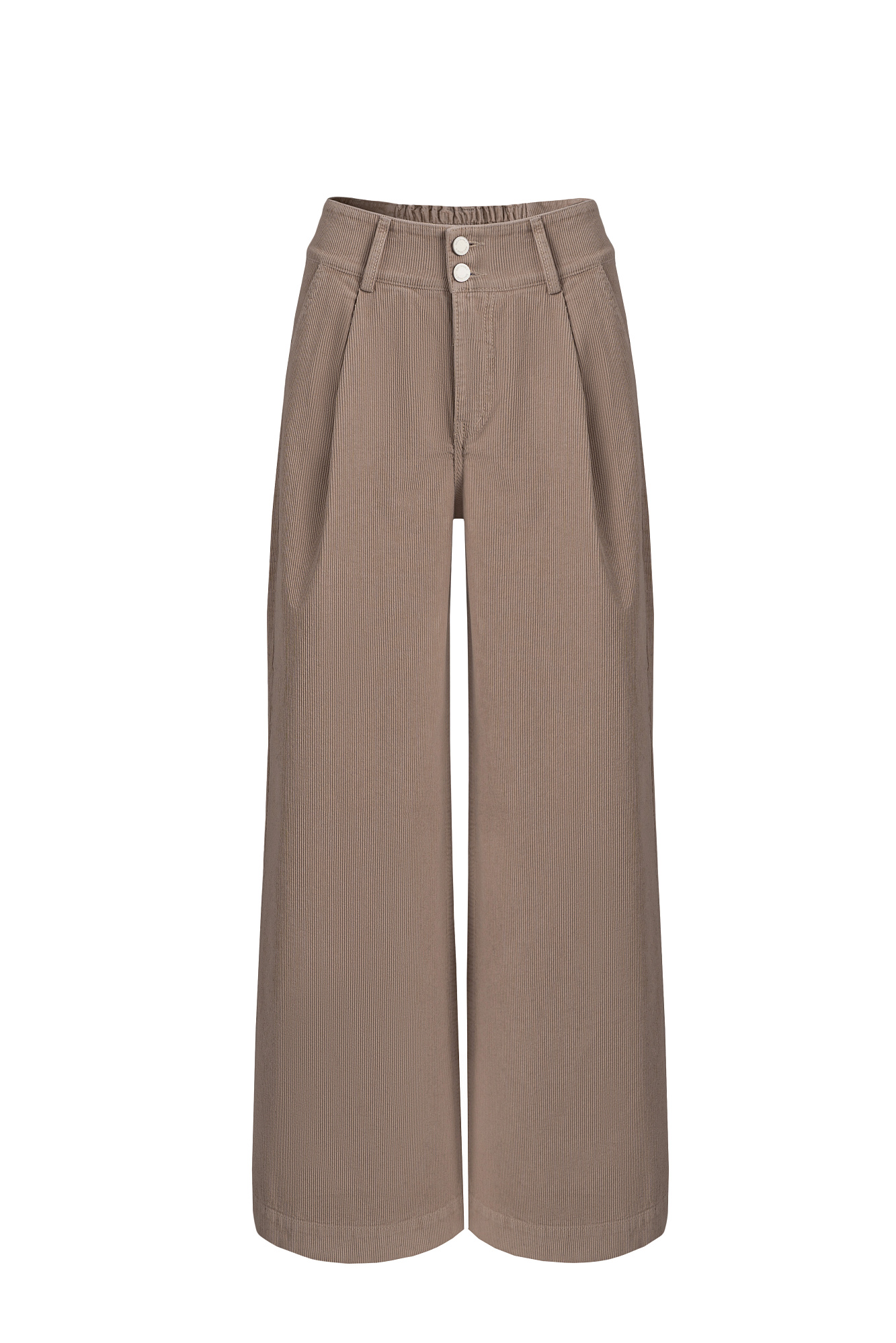 Вельветовые брюки из 100% хлопка с высокой посадкой. Модель с широким поясом и шлевками для ремня, сзади пояс выполнен на резинке. Застежка на две металлические пуговицы и молнию. Дополнить образ можно жакетом.