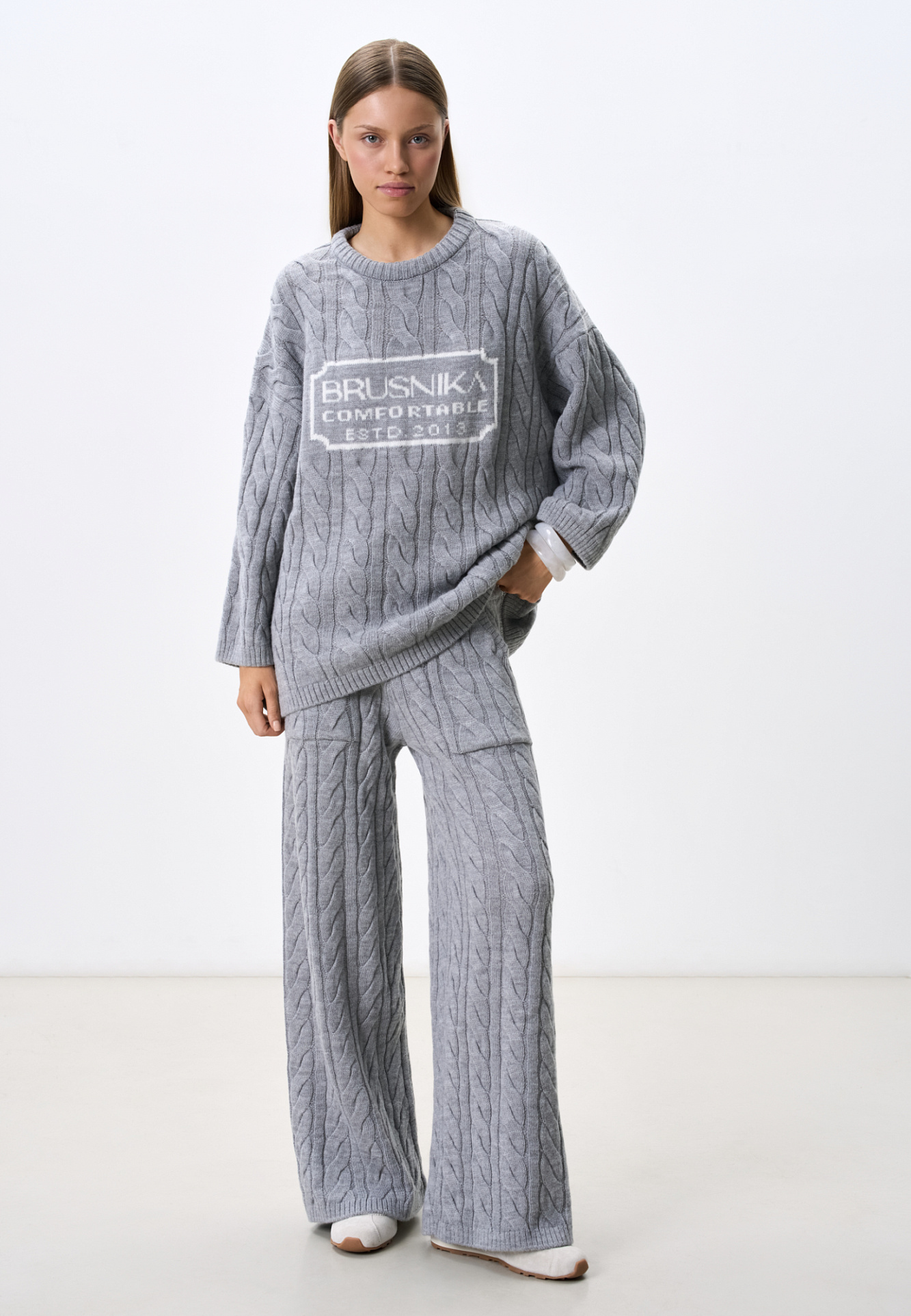 Прямые трикотажные брюки с объемными косами из мягкой шерсти. Широкий эластичный пояс на кулиске, передние и задние карманы и манжеты внизу. Дополнить образ можно джемпером в том же стиле.