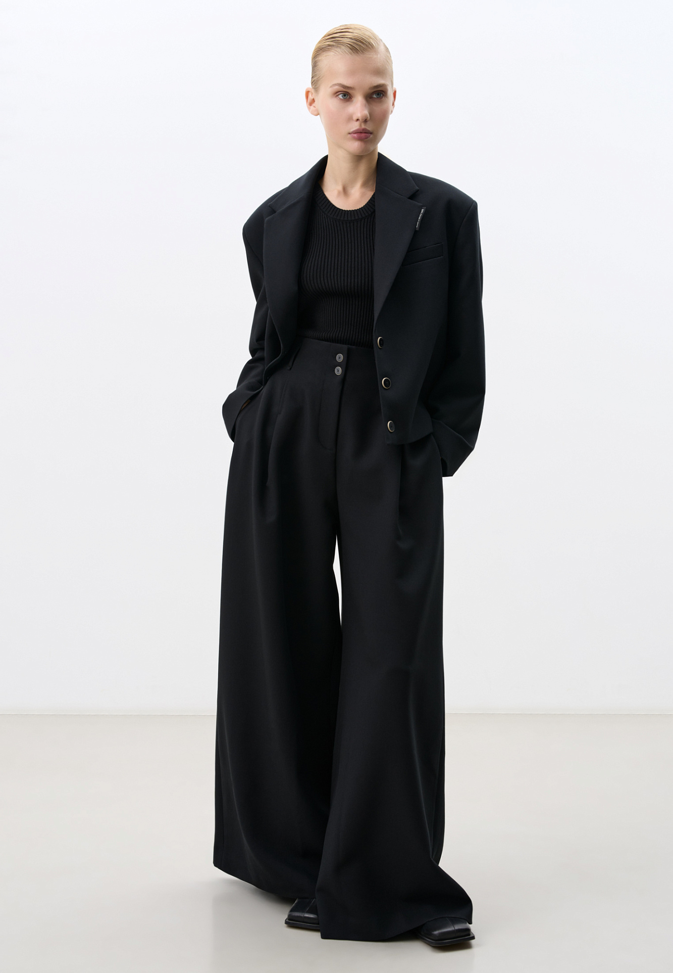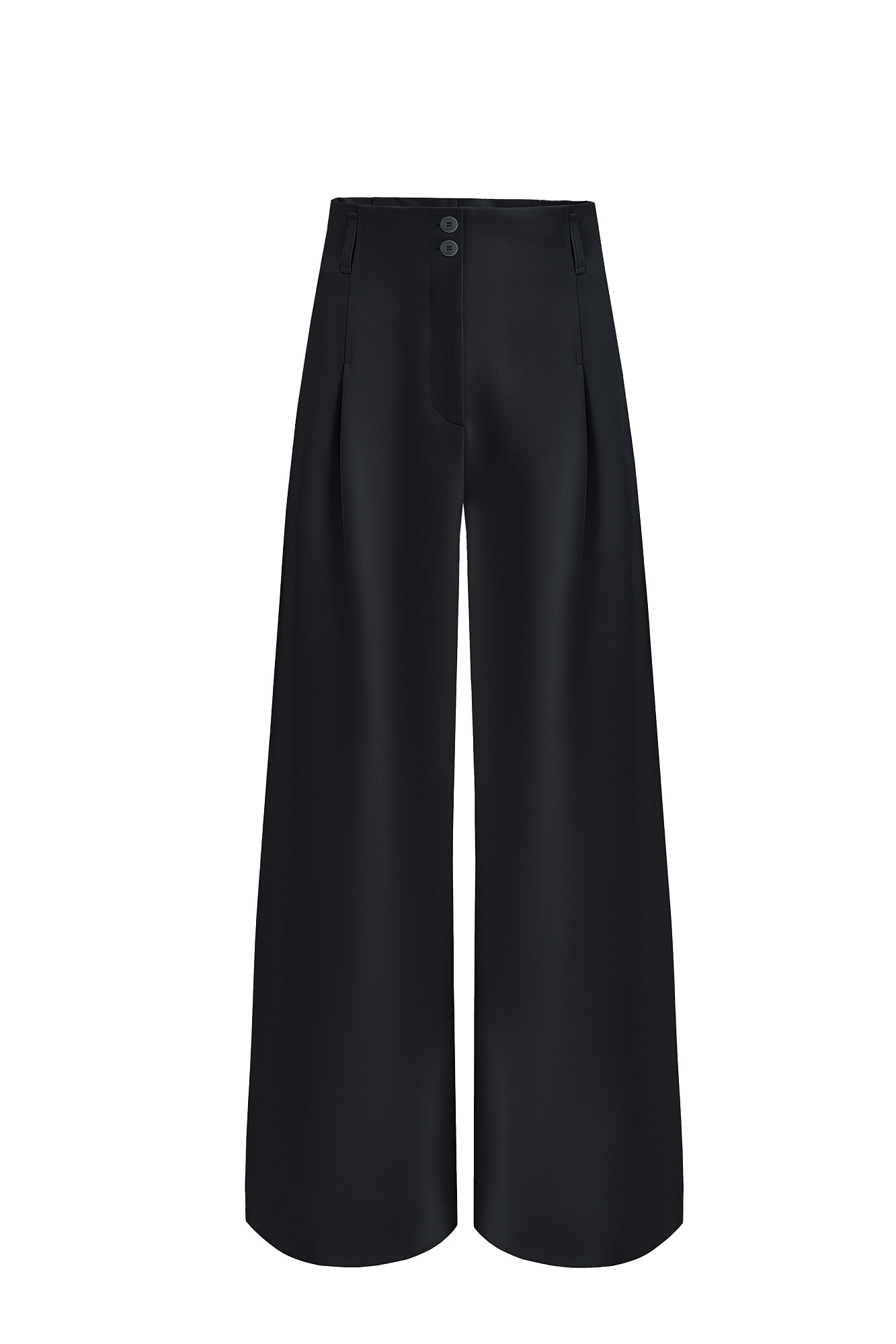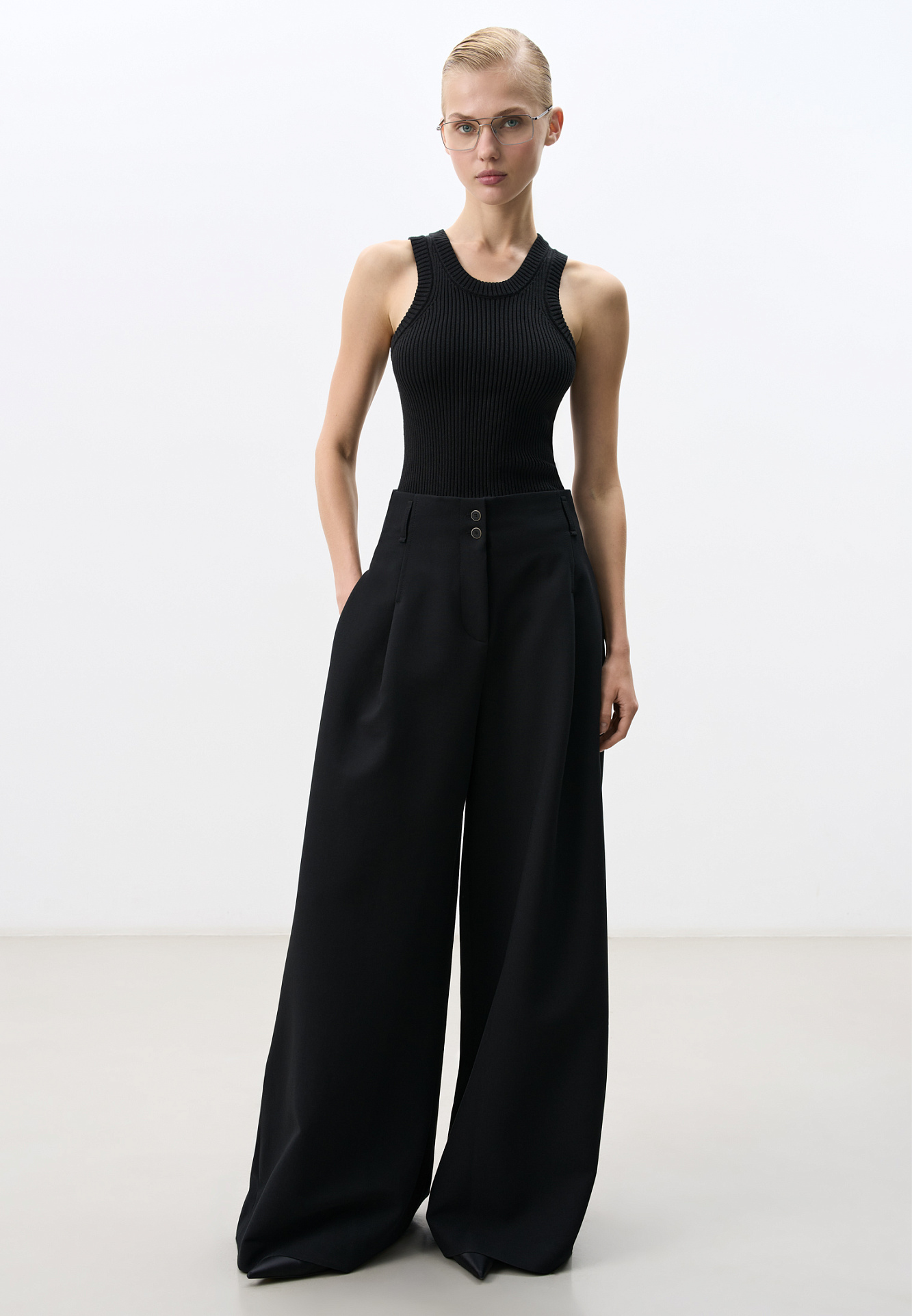 Брюки из поливискозы с высокой посадкой. Модель прямого кроя с защипами и боковыми карманами. Паты на поясе для ремня. Застежка на молнию и две пуговицы.