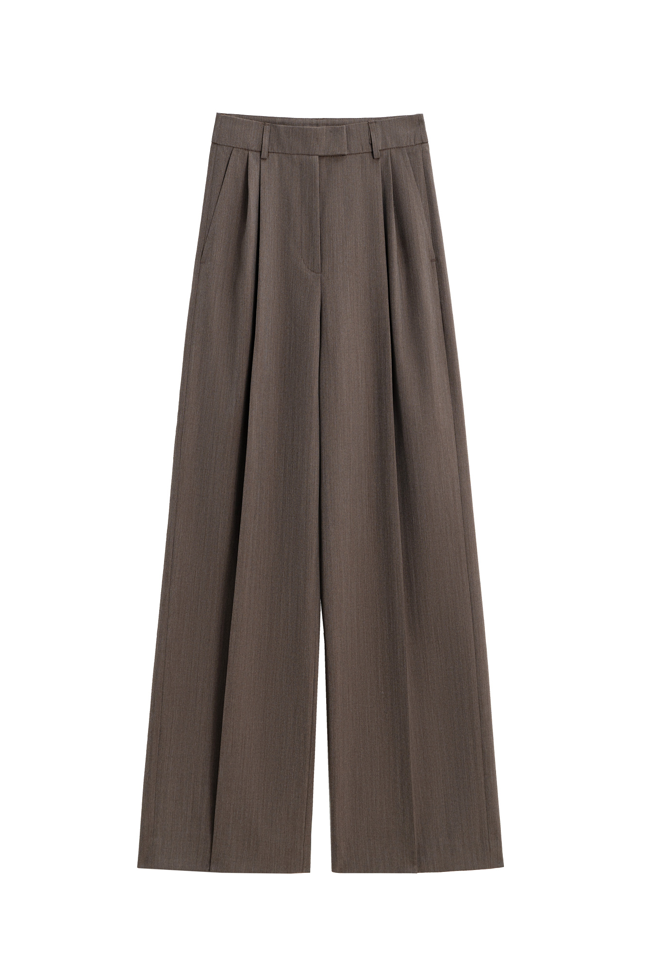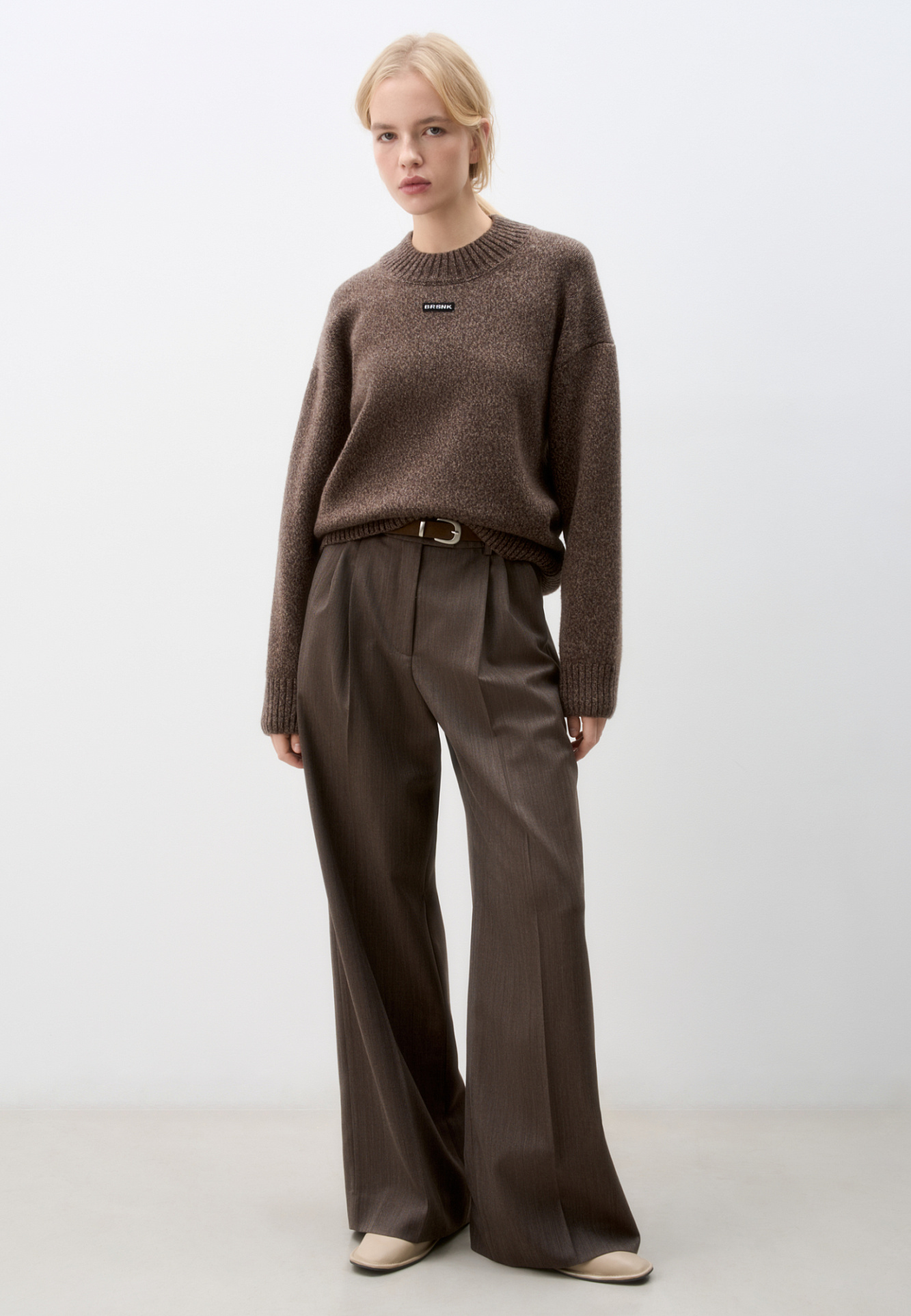 Брюки палаццо из шерсти с текстурой "ёлочка". Модель прямого свободного силуэта, с боковыми и задними карманами и шлевками на поясе для ремня. Застежка на молнию, скрытую пуговицу и брючный крючок.