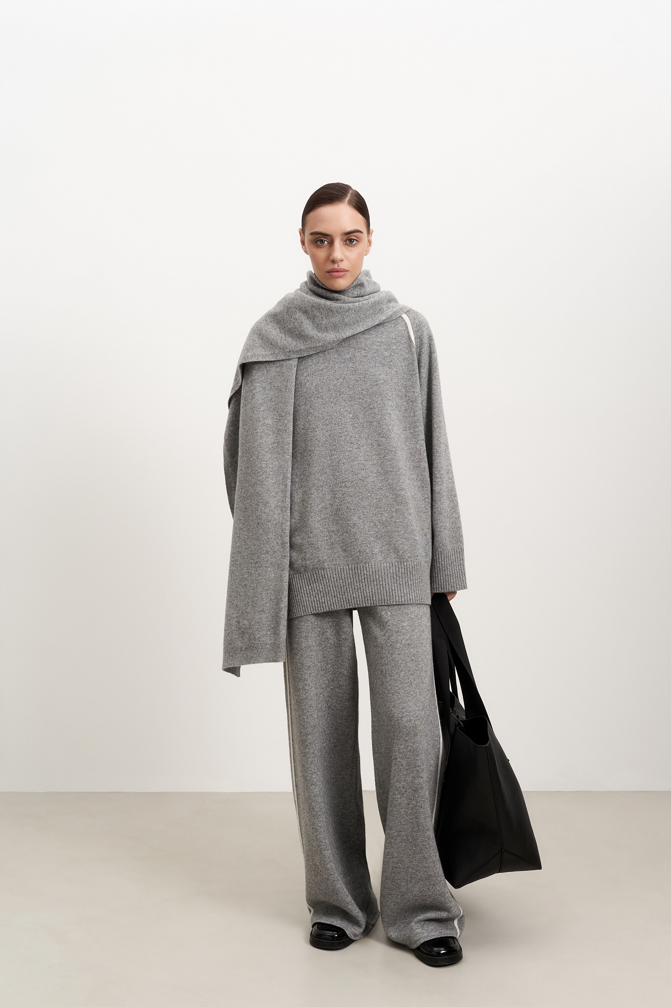 Трикотажные брюки из кашемира и шерсти. Модель свободного силуэта со средней посадкой, боковыми вывязанными карманами и эластичным поясом на кулиске. Изделие декорировано лампасами контрастного цвета.