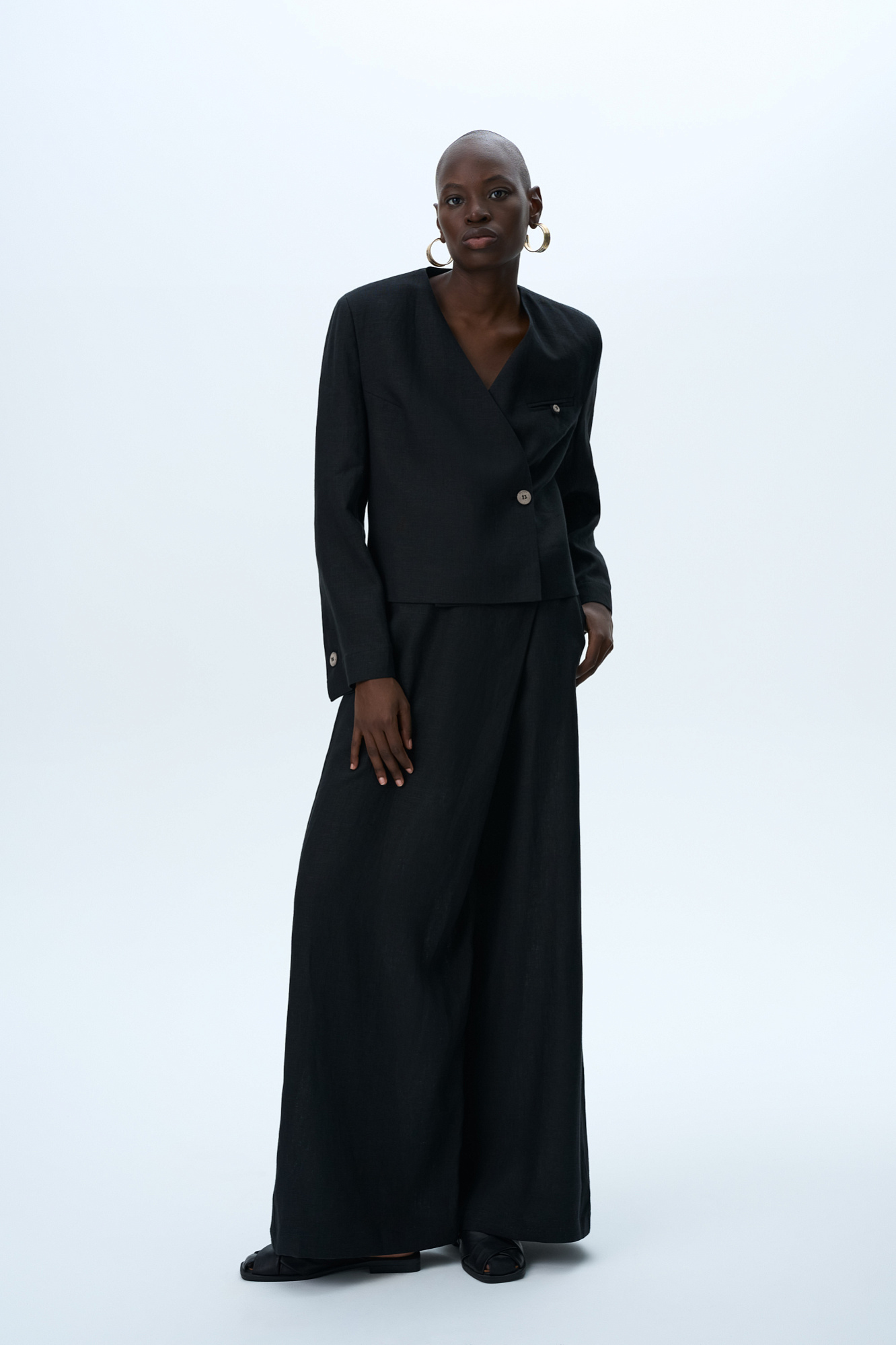 Прямые брюки на запах из 100% льна. Модель свободного силуэта с боковыми карманами и застежкой на пуговицу. Дополнить образ можно жакетом в таком же стиле.