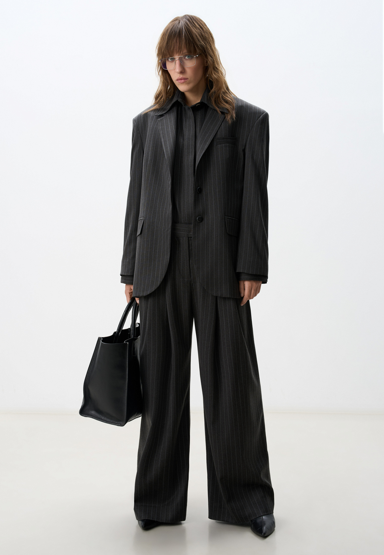 Широкие офисные брюки из полушерсти. Модель свободного кроя с защипами спереди, карманами, шлевками на поясе для ремня и застежкой на молнию и скрытую пуговицу. Дополнить образ можно жакетом и рубашкой.