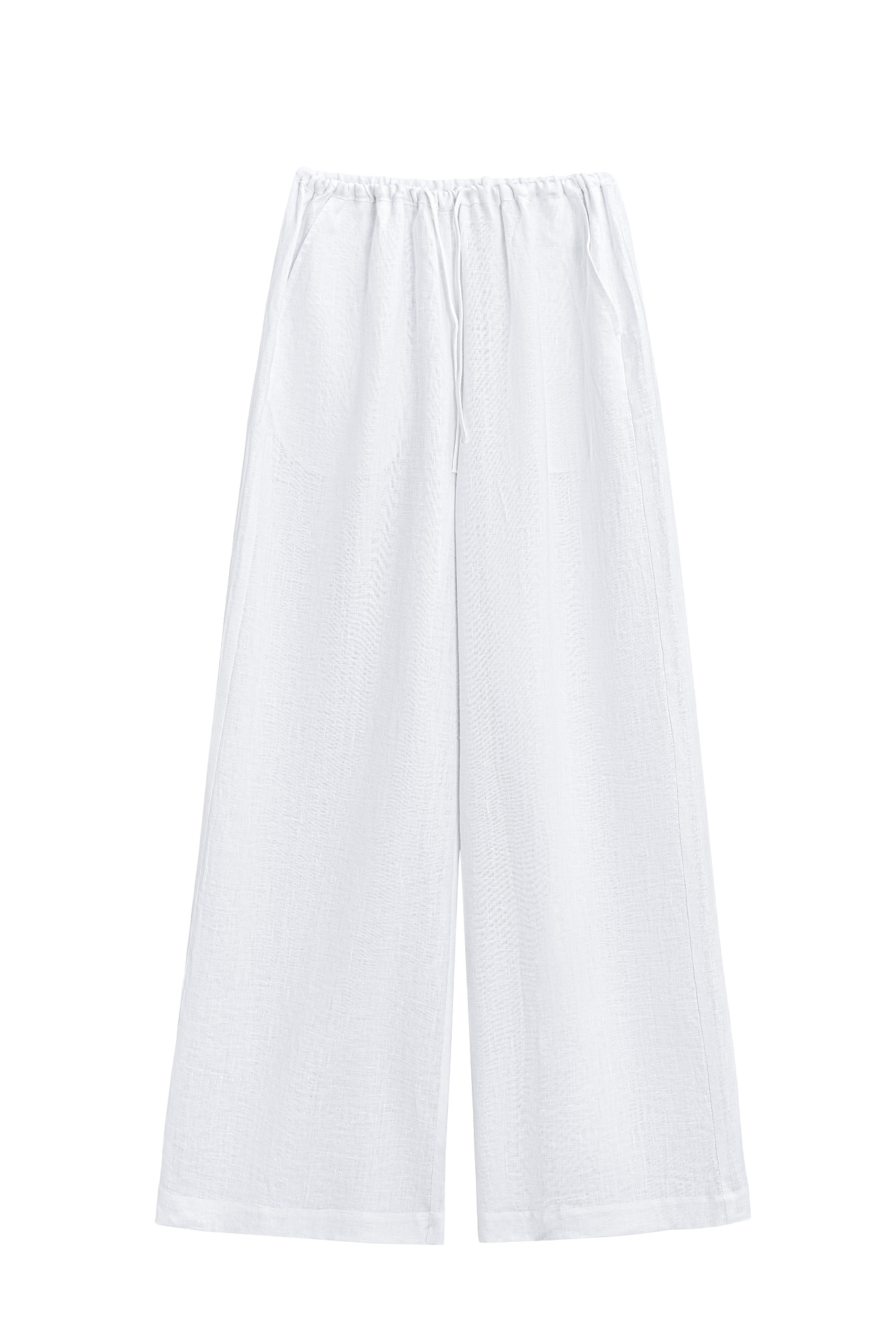Широкие брюки из 100% льна. Модель свободного прямого кроя с врезными карманами по бокам. Изделие выполнено с поясом на узкой резинке, дополненным кулиской.