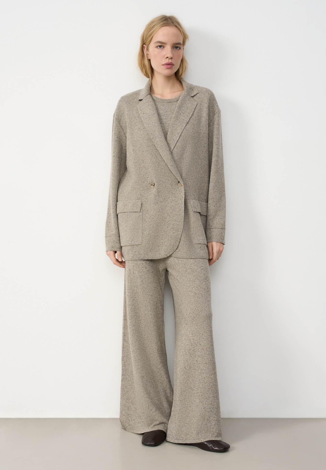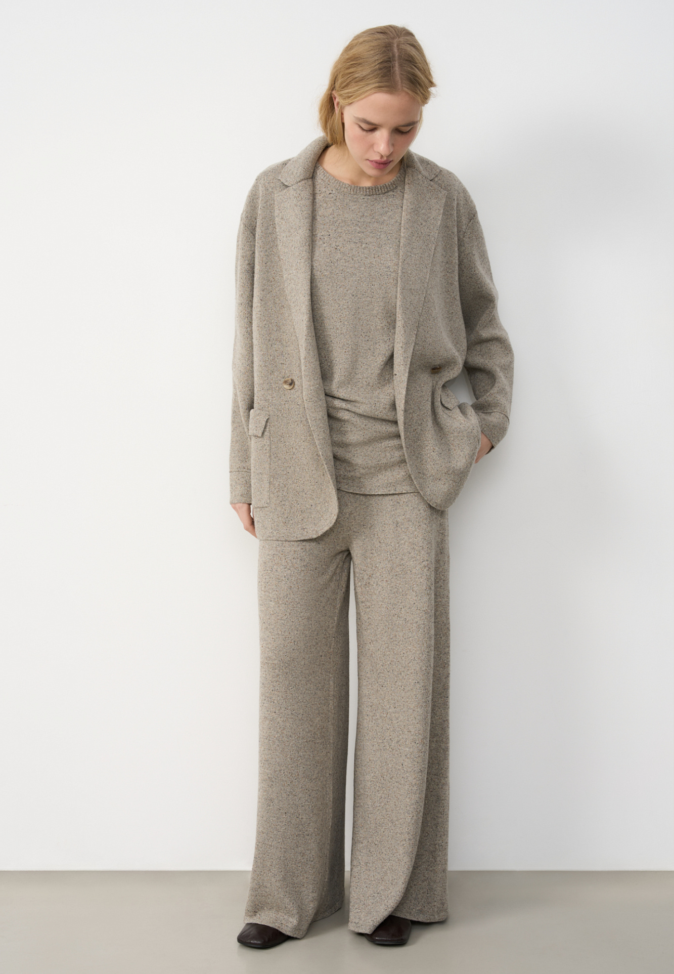 Трикотажные меланжевые брюки из мягкой шерсти с добавлением шелка и вискозы. Модель прямого силуэта с широким поясом на кулиске. Можно дополнить жилетом из такой же пряжи.