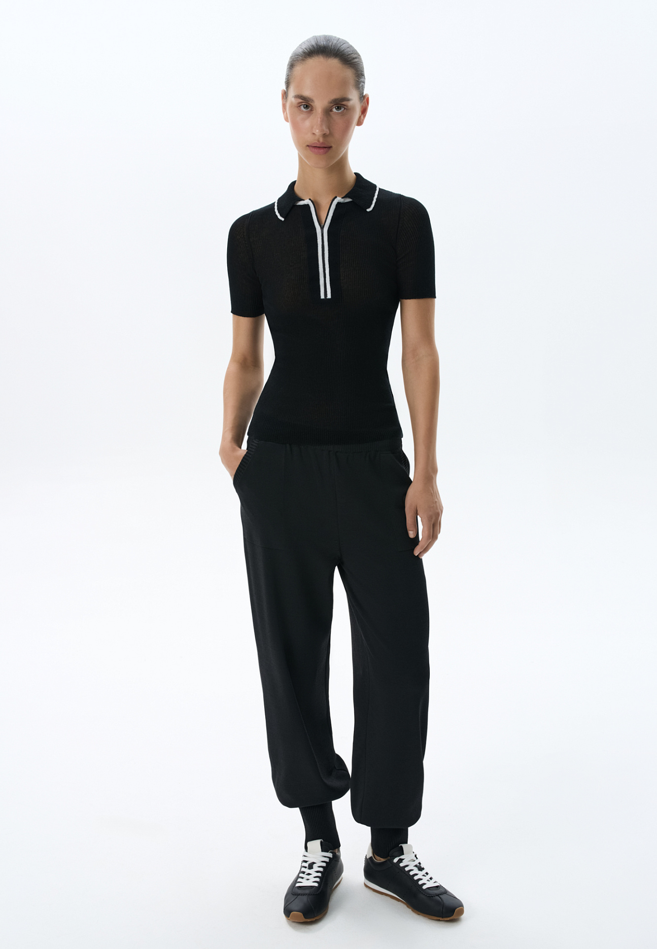 Трикотажные брюки из плотной вискозы в спортивном стиле. Регулируемый пояс на шнурке. Боковые карманы. Эластичные манжеты.