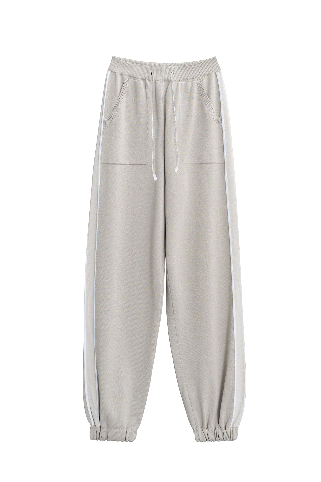 Трикотажные брюки-джоггеры из вискозы. Модель выполнена в спортивном стиле, с эластичным поясом со шнурком, боковыми карманами и манжетами на резинке. Изделие декорировано широкими лампасами контрастного цвета.
