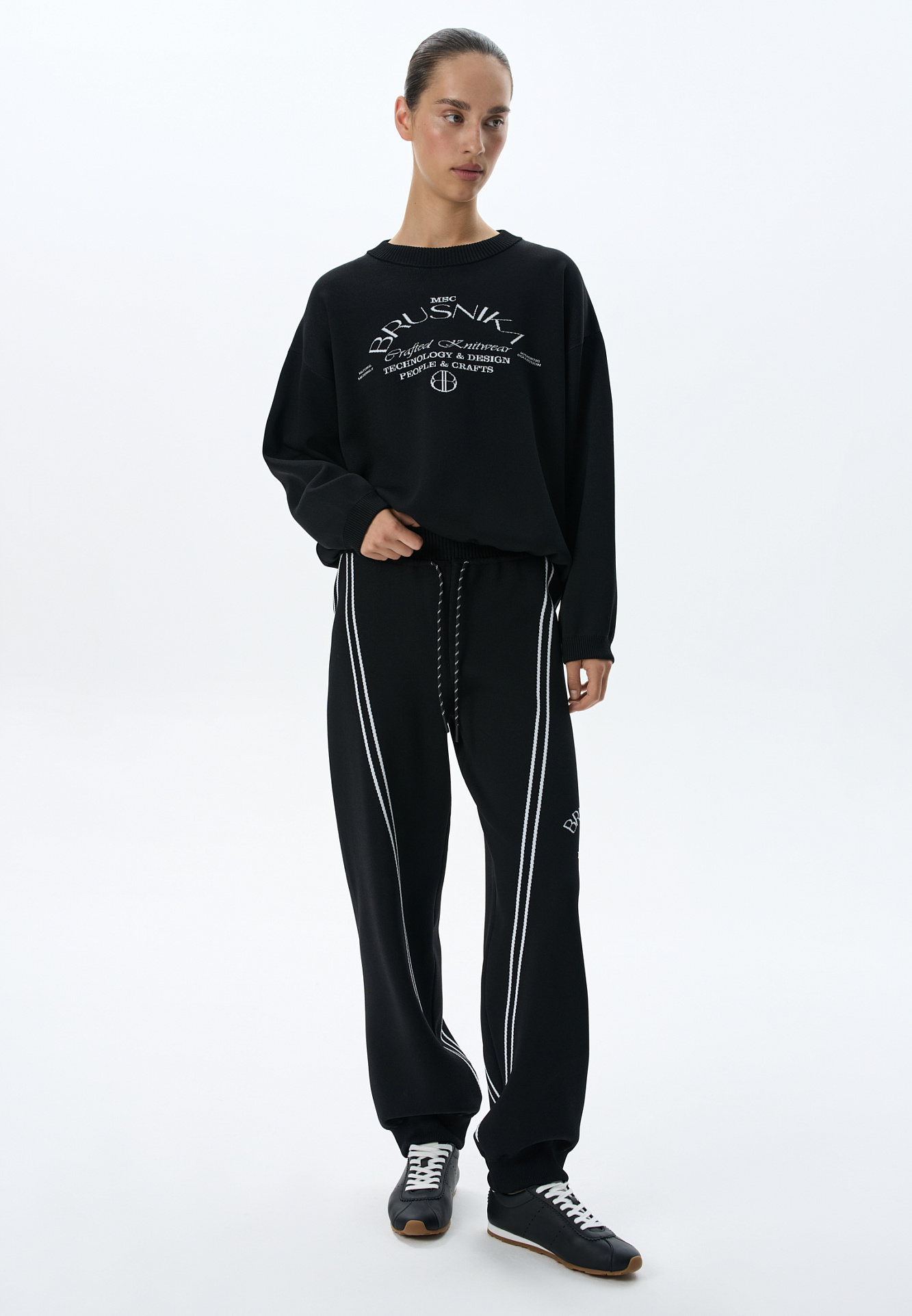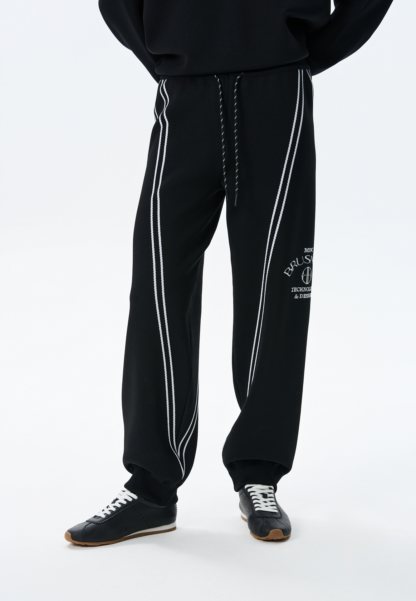 Трикотажные джоггеры из вискозы. Модель свободного силуэта, с широким эластичным поясом на кулиске, боковыми и задними карманами. Изделие декорировано брендированным жаккардом и лампасами контрастного цвета.