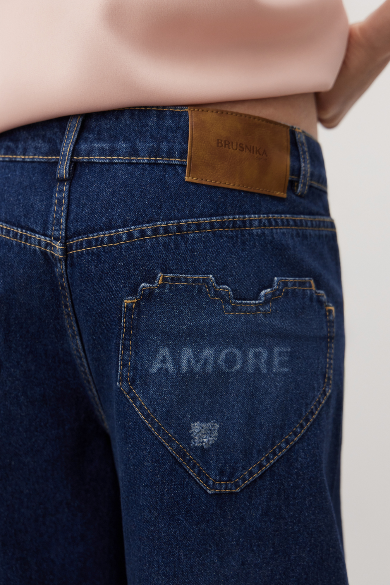 Джинсы из 100% хлопка с принтом в виде сердечек. Модель прямого силуэта со средней посадкой. Изделие декорировано разрезом на коленке и фигурными задними карманами в виде сердец. Застежка на молнию и пуговицу.