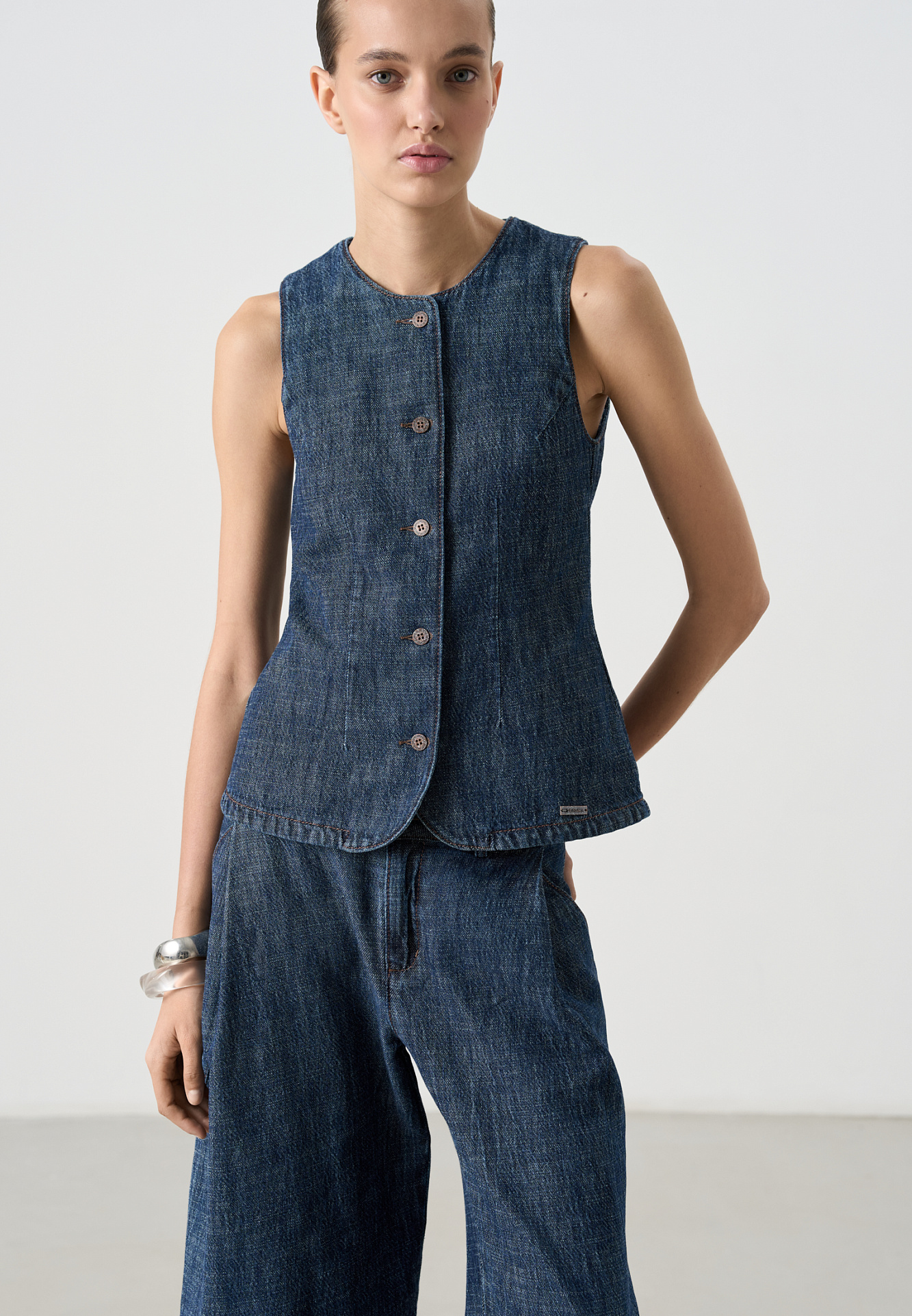 Джинсы из 100% хлопка. Модель прямого кроя, с низкой посадкой, акцентными защипами на талии, шлевками на поясе для ремня и застежкой на молнию и пуговицу.