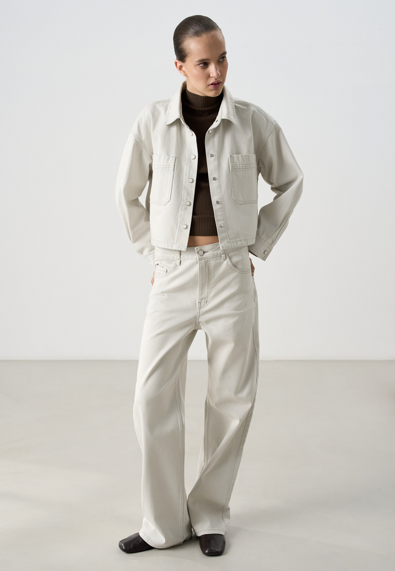 Прямые джинсы из 100% хлопка. Модель с высокой посадкой, шлевками на поясе для ремня, дополнительными шлевками и узким поясом в комплекте. Пять карманов. Застежка на молнию и пуговицу.