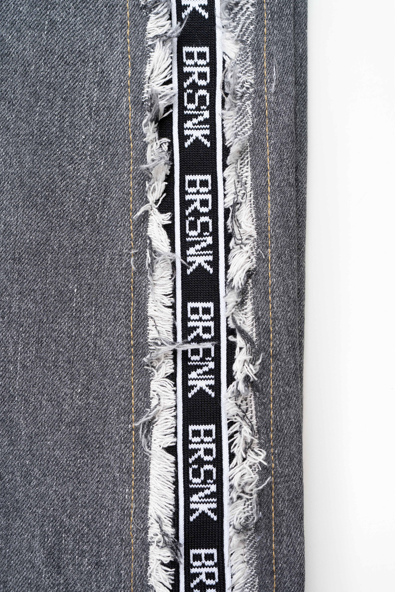 Джинсы из хлопка с деталями из экокожи и трикотажным лампасом. Модель прямого силуэта, с боковыми карманами, шлевками из джинсы и экокожи на поясе для ремня. Застежка на молнию и пуговицу. Изделие декорировано рваной текстурой.