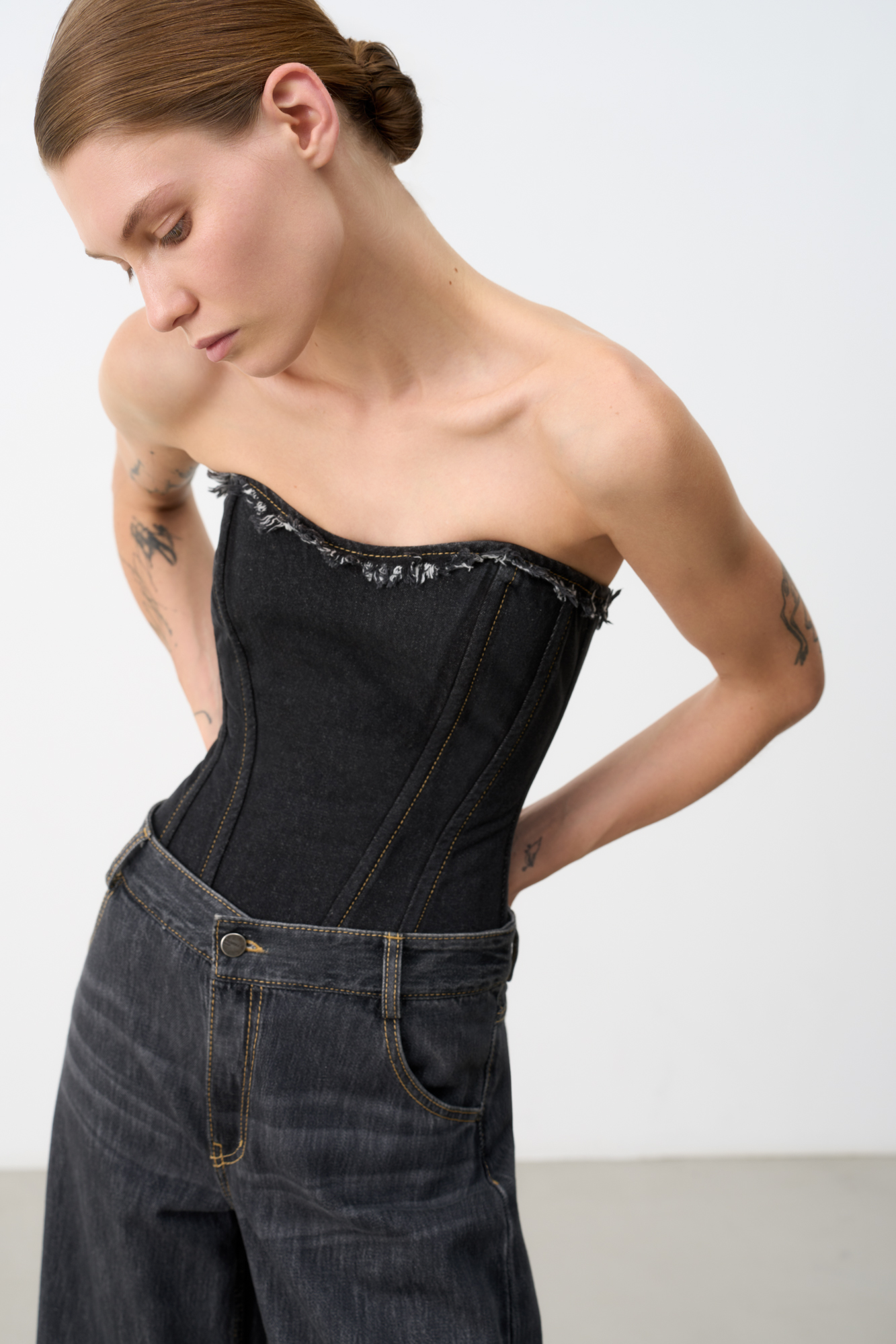 Джинсовый корсет из 100% хлопка. Модель без бретелей, с фигурным вырезом по верхнему краю. Верхний и нижний края декорированы бахромой. Рельефные швы спереди формируют силуэт.