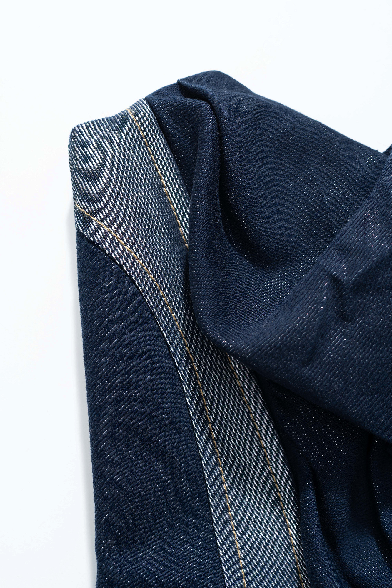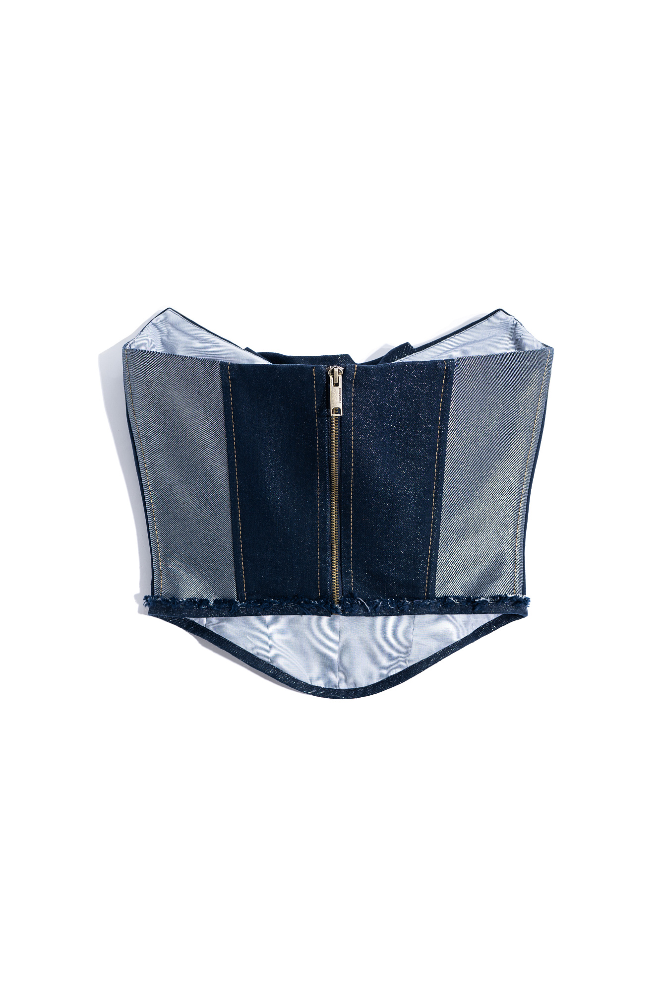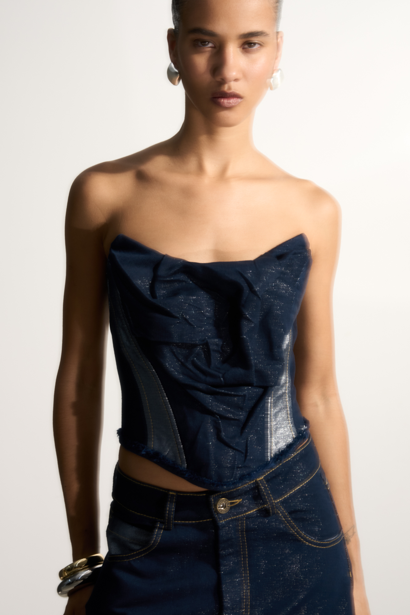 Корсет из денима с металлизированной нитью. Модель без бретелей, с фигурным вырезом декольте и объемным декором. Застежка на молнию.