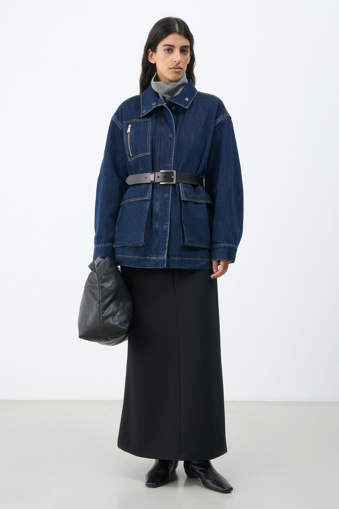 Джинсовая куртка из 100% хлопка с рельефными швами. Модель свободного силуэта со спущенной линией плеча, воротником-стойкой и накладными карманами. Застежка на молнию и кнопки. Изделие без подкладки.