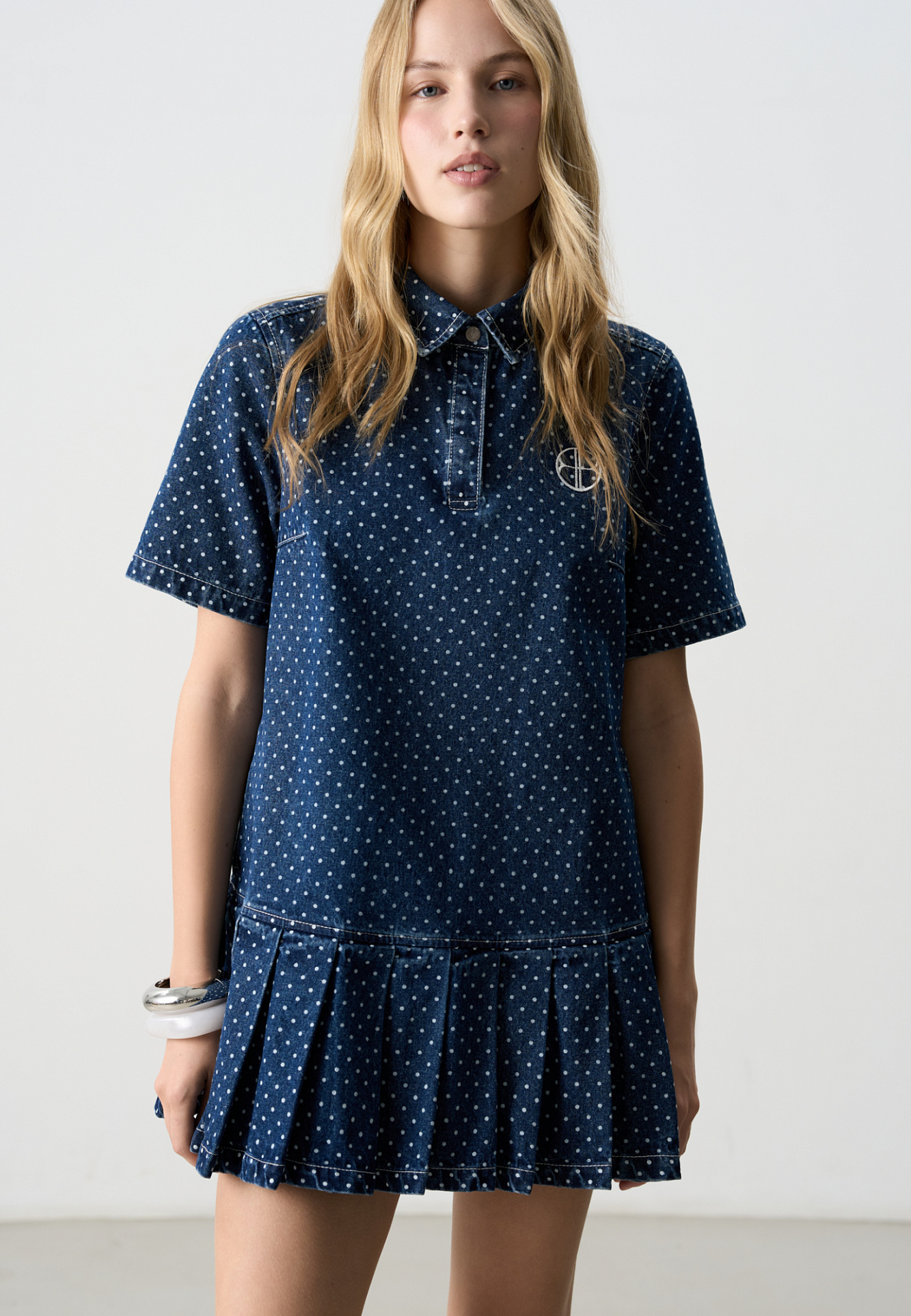 Джинсовое платье длины мини из 100% хлопка с принтом горошек. Модель прямого кроя с юбкой в складку, короткими рукавами, отложным воротником с застежкой на магнитные кнопки.
