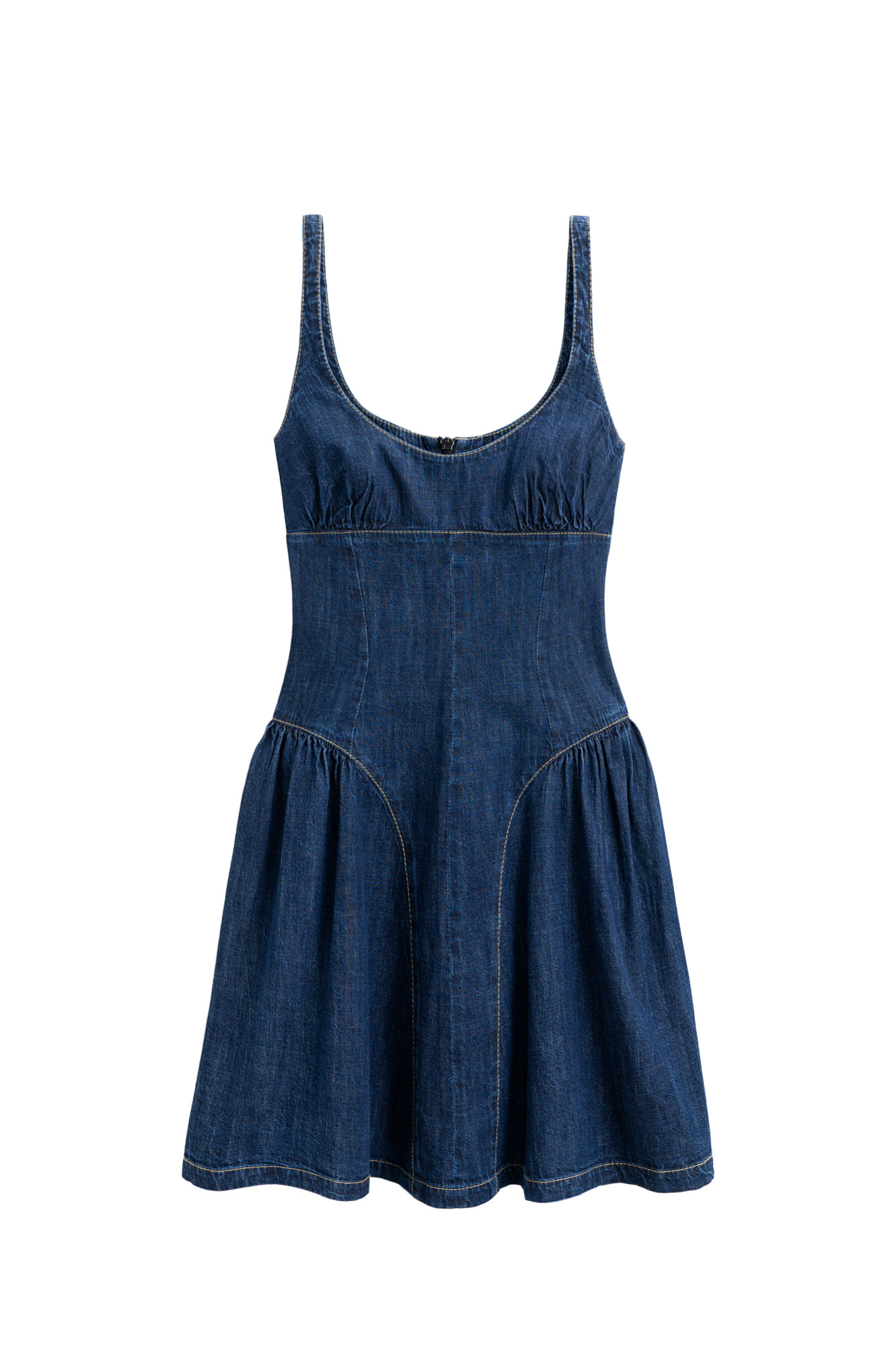 Джинсовое платье длины мини из 100% хлопка. Модель приталенного силуэта с акцентными вытачками по фигуре, без рукавов, U-образным вырезом, на тонких нерегулируемых бретельках и расклешенной юбкой. Застежка на молнию сзади.