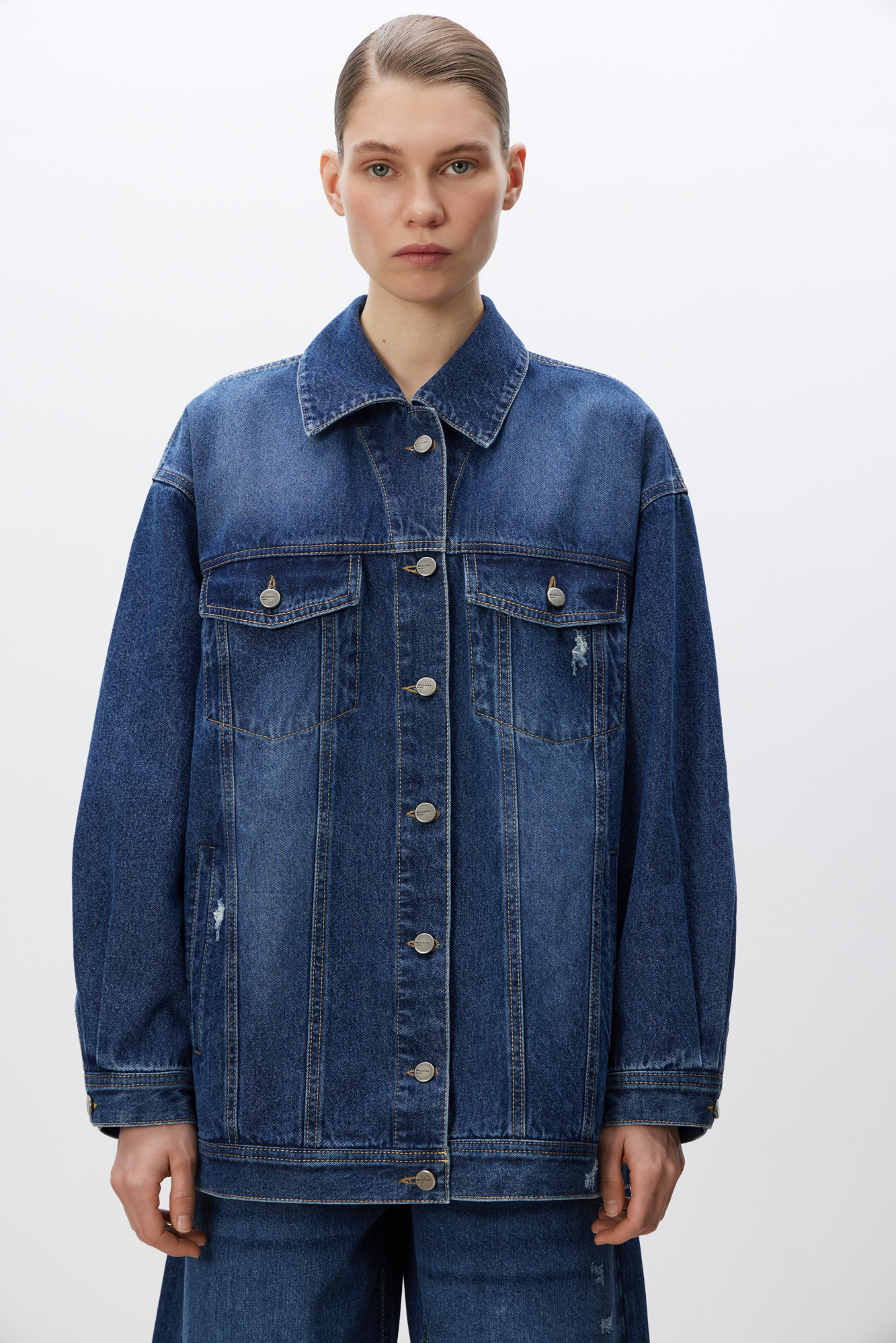 Джинсовый жакет из 100% хлопка. Модель прямого кроя, с отложным воротником, длинными рукавами с манжетами на пуговицах. Изделие декорировано накладными карманами на груди и боковыми карманами спереди. Застежка на пуговицы.
