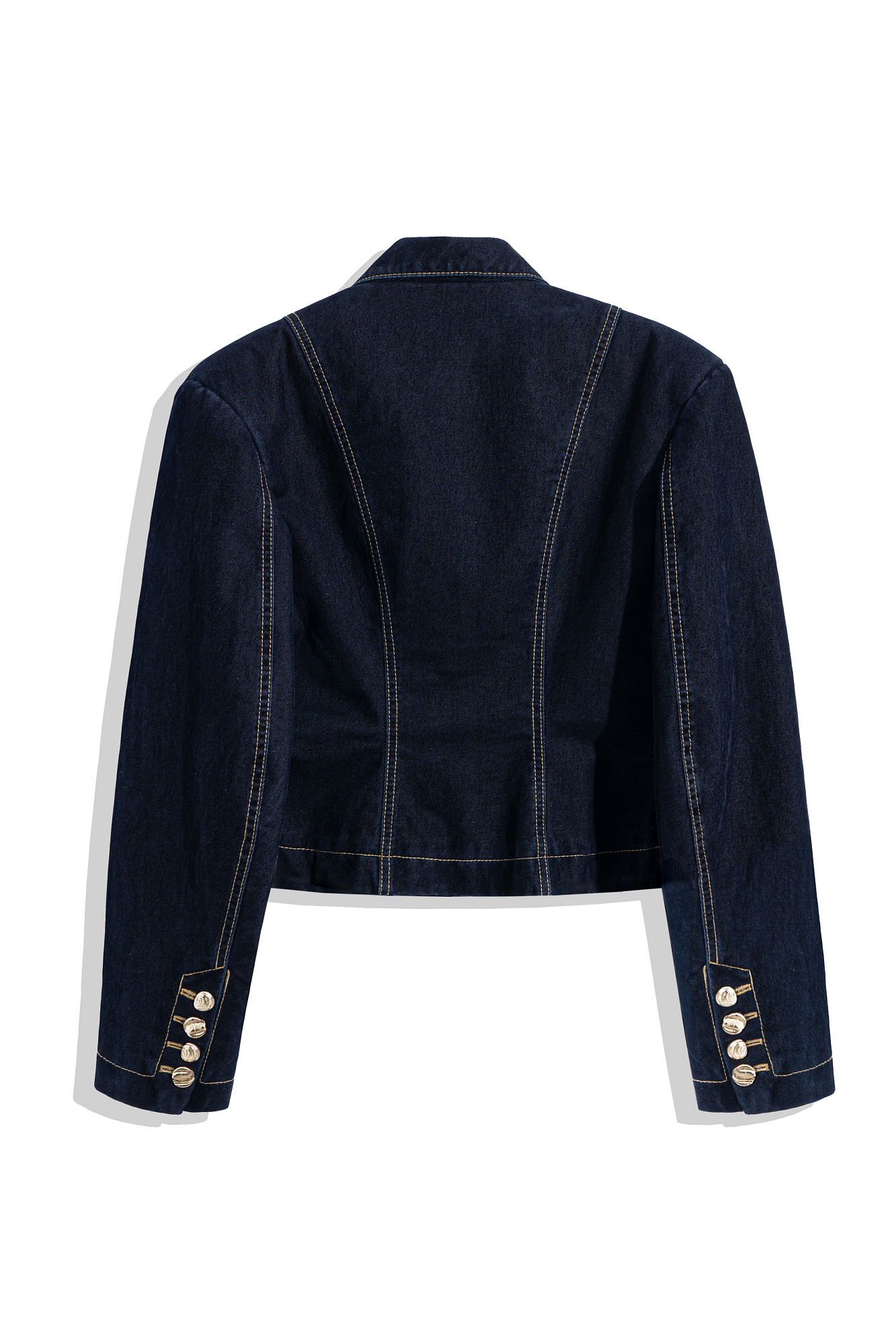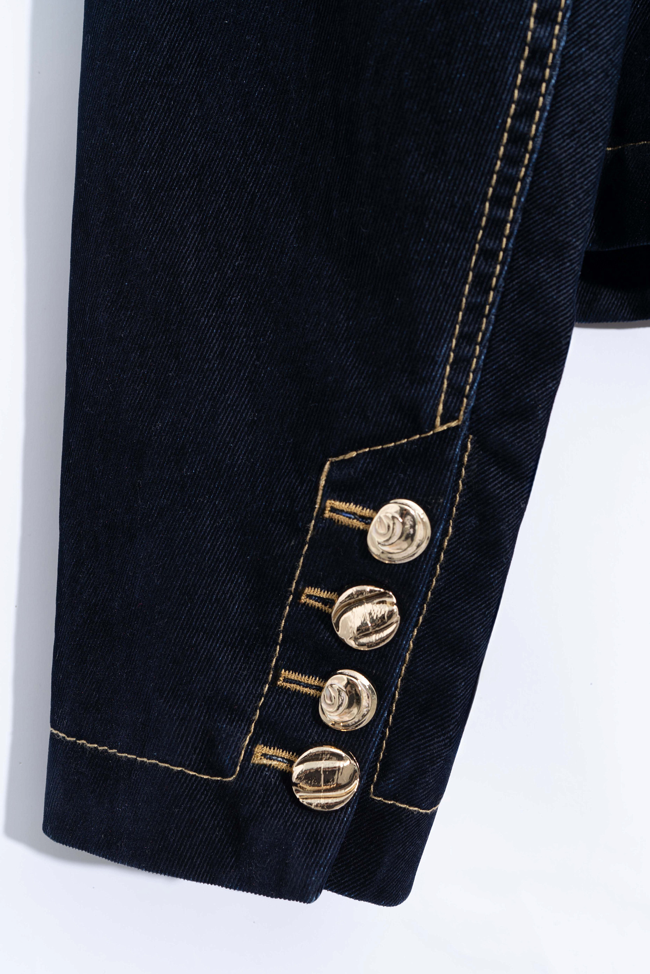 Укороченный жакет из флокированного денима - 100% хлопка с имитацией бархатной текстуры. Модель приталенного силуэта с узкими лацканами, карманами с клапанами и подплечниками. Застежка на крупные пуговицы. Изделие выполнено на подкладке.