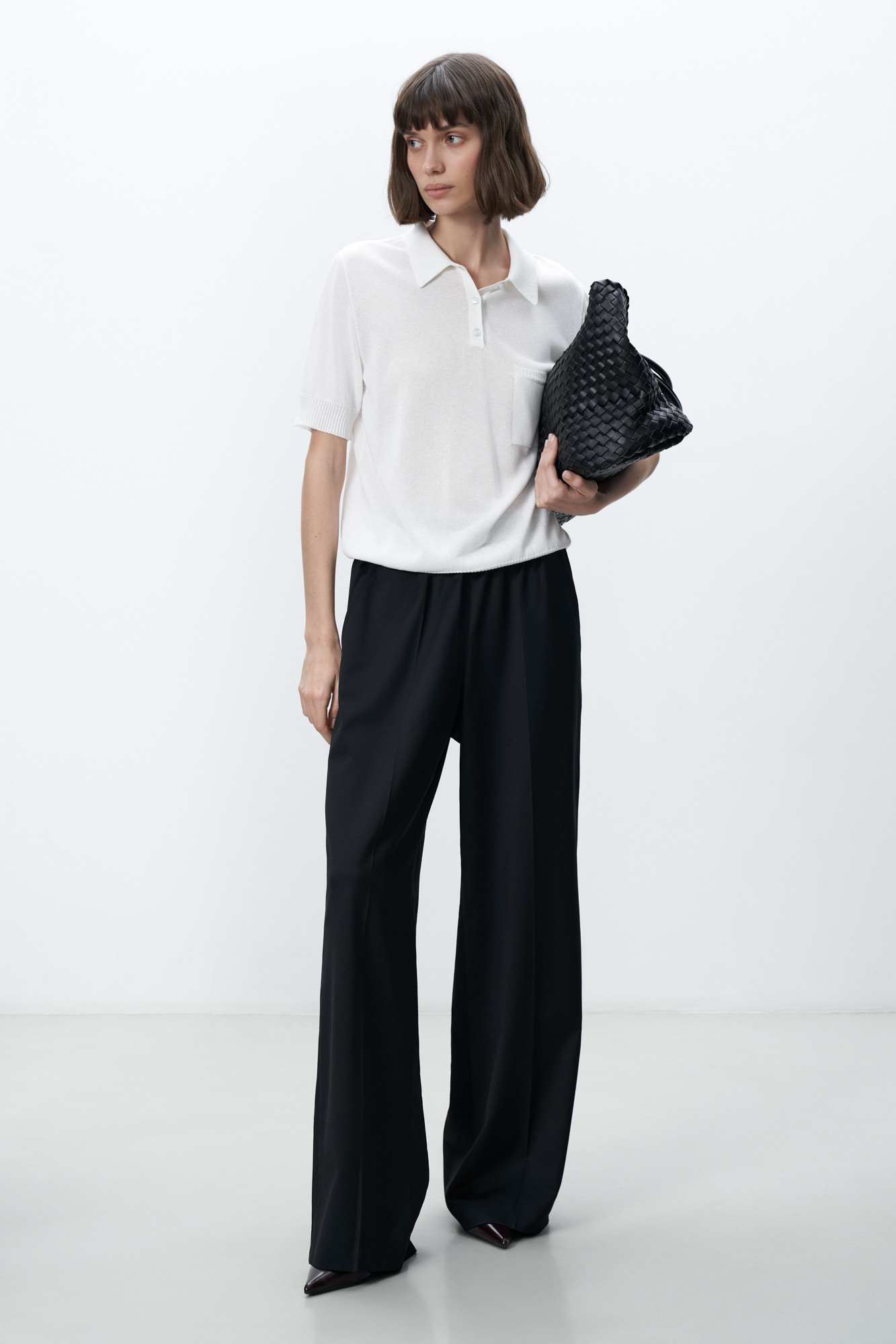 Широкие прямые брюки из полушерсти. Модель с эластичным поясом на резинке и карманами.