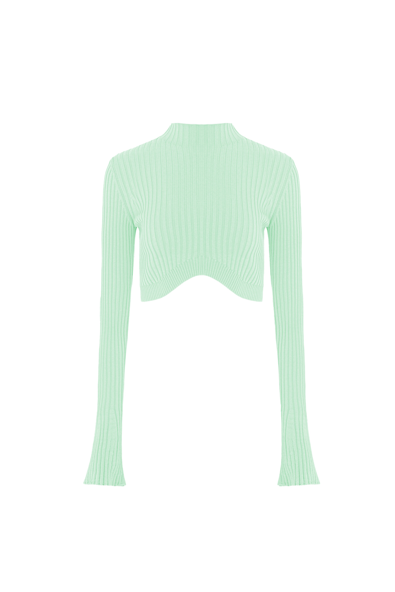 Трикотажный топ в рубчик с длинным рукавом и фигурным низом. Дополнить образ можно юбкой в таком же стиле.