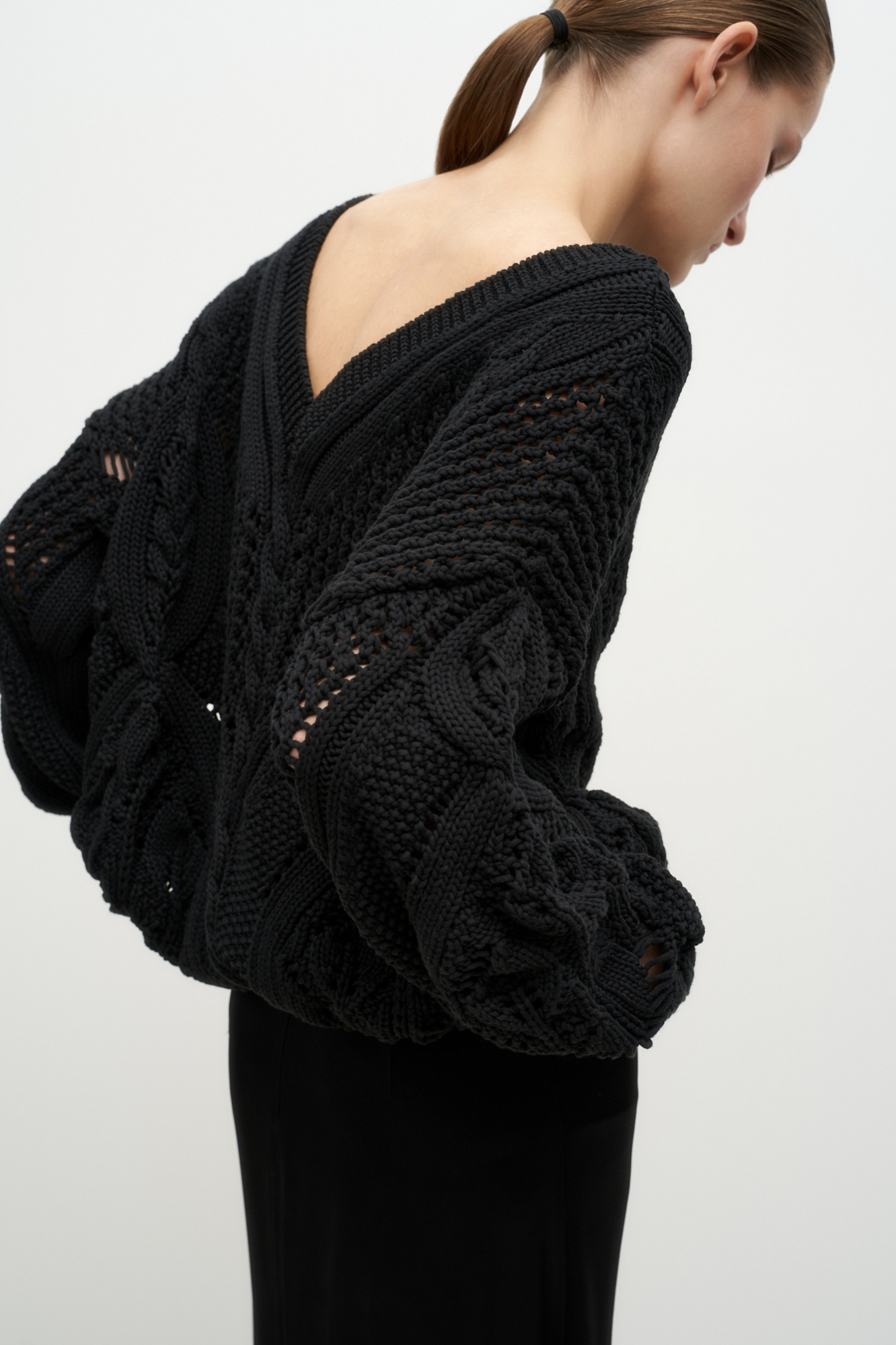 Ажурный джемпер из хлопка с V-образным вырезом. Свободная посадка, длинный рукав с манжетами. Джемпер станет прекрасным дополнением к брюкам и к юбке, а фасон позволяет носить джемпер как вырезом на груди, так и на спине.