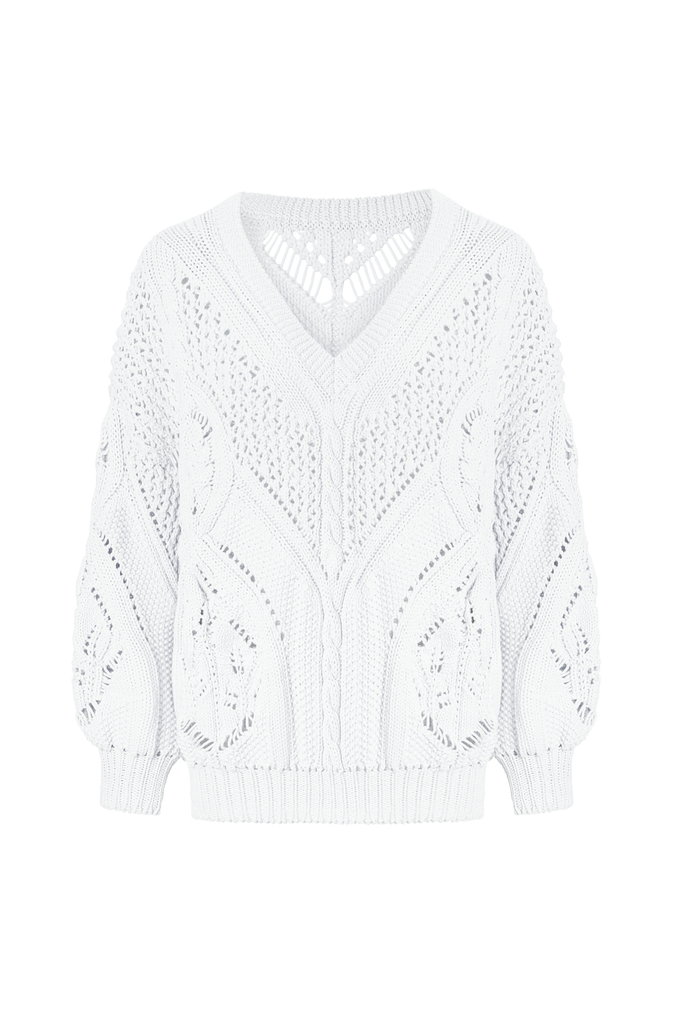 Ажурный джемпер из хлопка с V-образным вырезом. Свободная посадка, длинный рукав с манжетами. Джемпер станет прекрасным дополнением к брюкам и к юбке, а фасон позволяет носить джемпер как вырезом на груди, так и на спине.