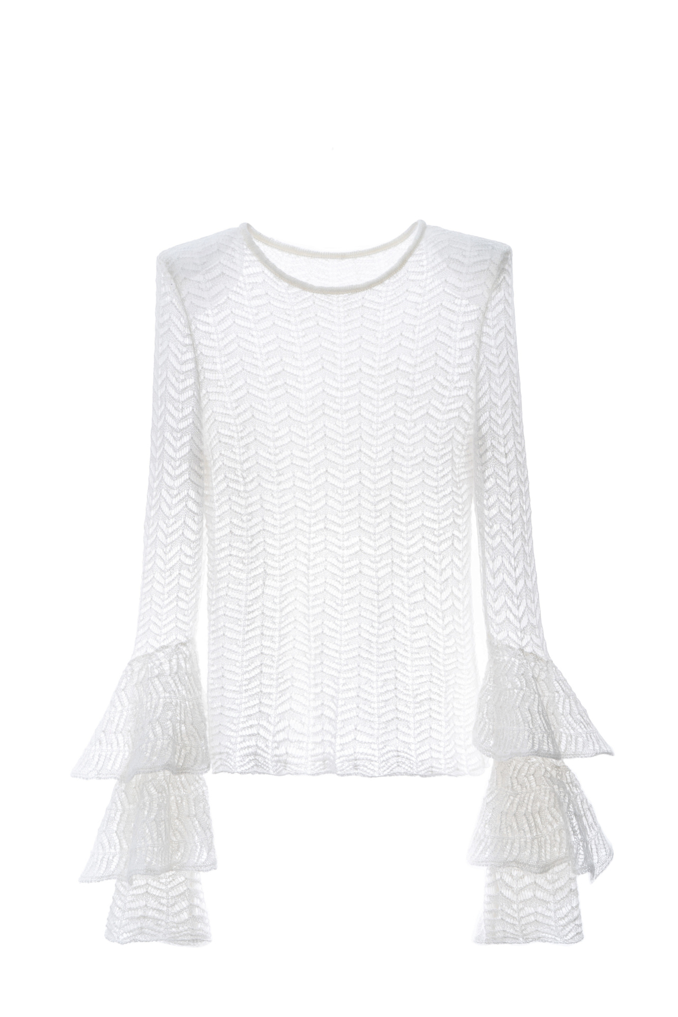 Трикотажный ажурный джемпер из шерсти с добавлением мохера. Модель по фигуре с круглым неглубоким вырезом горловины и подплечниками. Изделие декорировано ажурными воланами на манжетах.