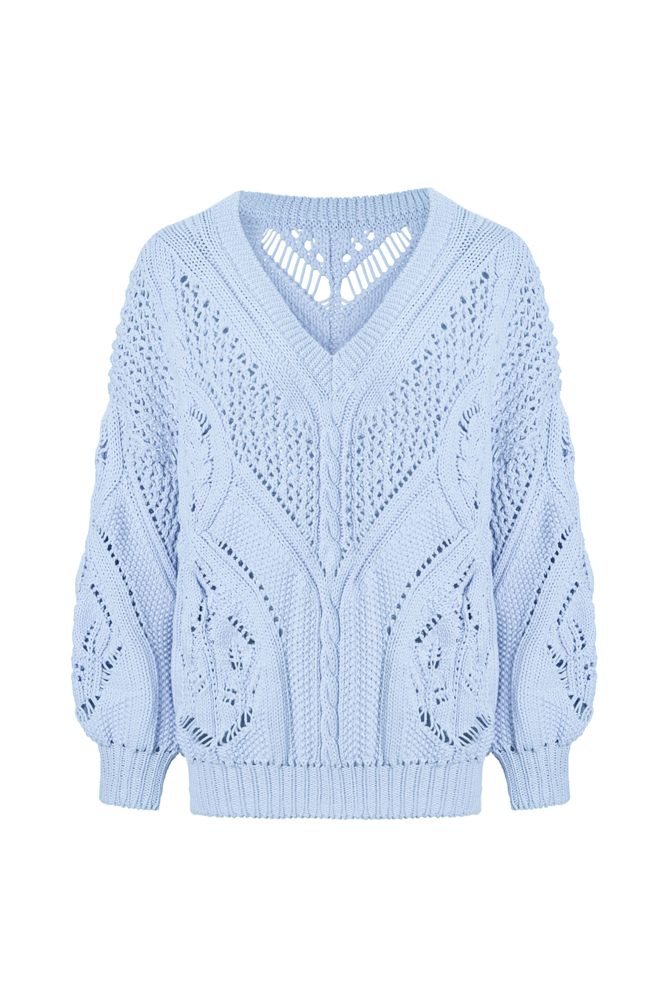 Ажурный джемпер из хлопка с V-образным вырезом. Свободная посадка, длинный рукав с манжетами. Джемпер станет прекрасным дополнением к брюкам и к юбке, а фасон позволяет носить джемпер как вырезом на груди, так и на спине.