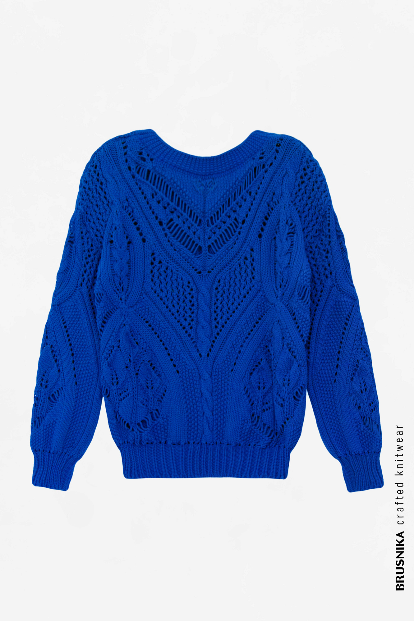 Ажурный джемпер из хлопка с V-образным вырезом. Свободная посадка, длинный рукав с манжетами. Джемпер станет прекрасным дополнением к брюкам и к юбке, а фасон позволяет носить джемпер как вырезом на груди, так и на спине.