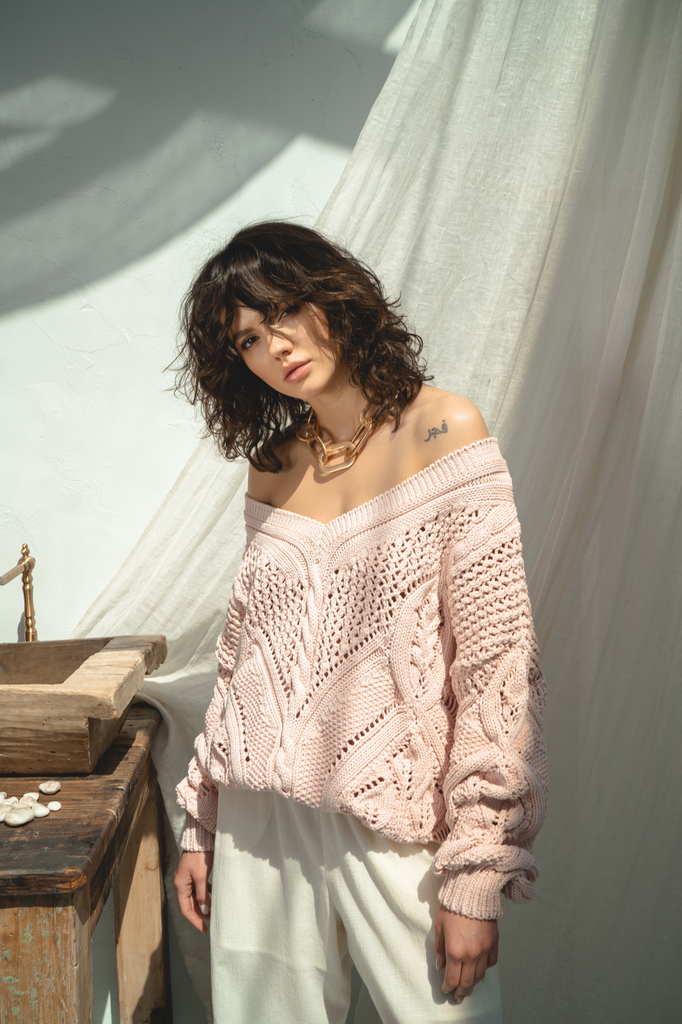 Ажурный джемпер из хлопка с V-образным вырезом. Свободная посадка, длинный рукав с манжетами. Джемпер станет прекрасным дополнением к брюкам и к юбке, а фасон позволяет носить джемпер как вырезом на груди, так и на спине.