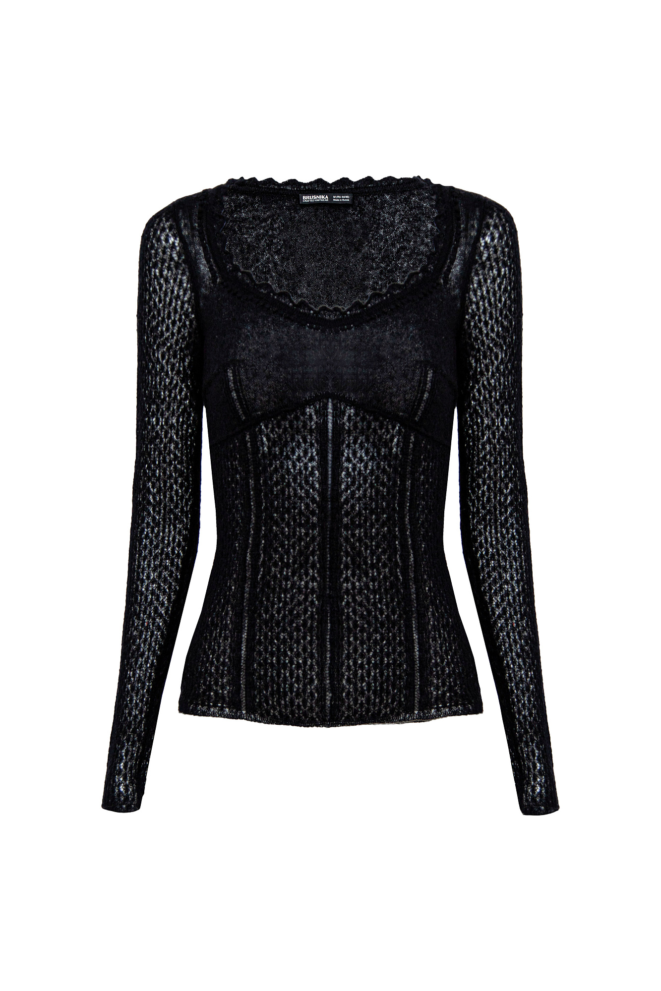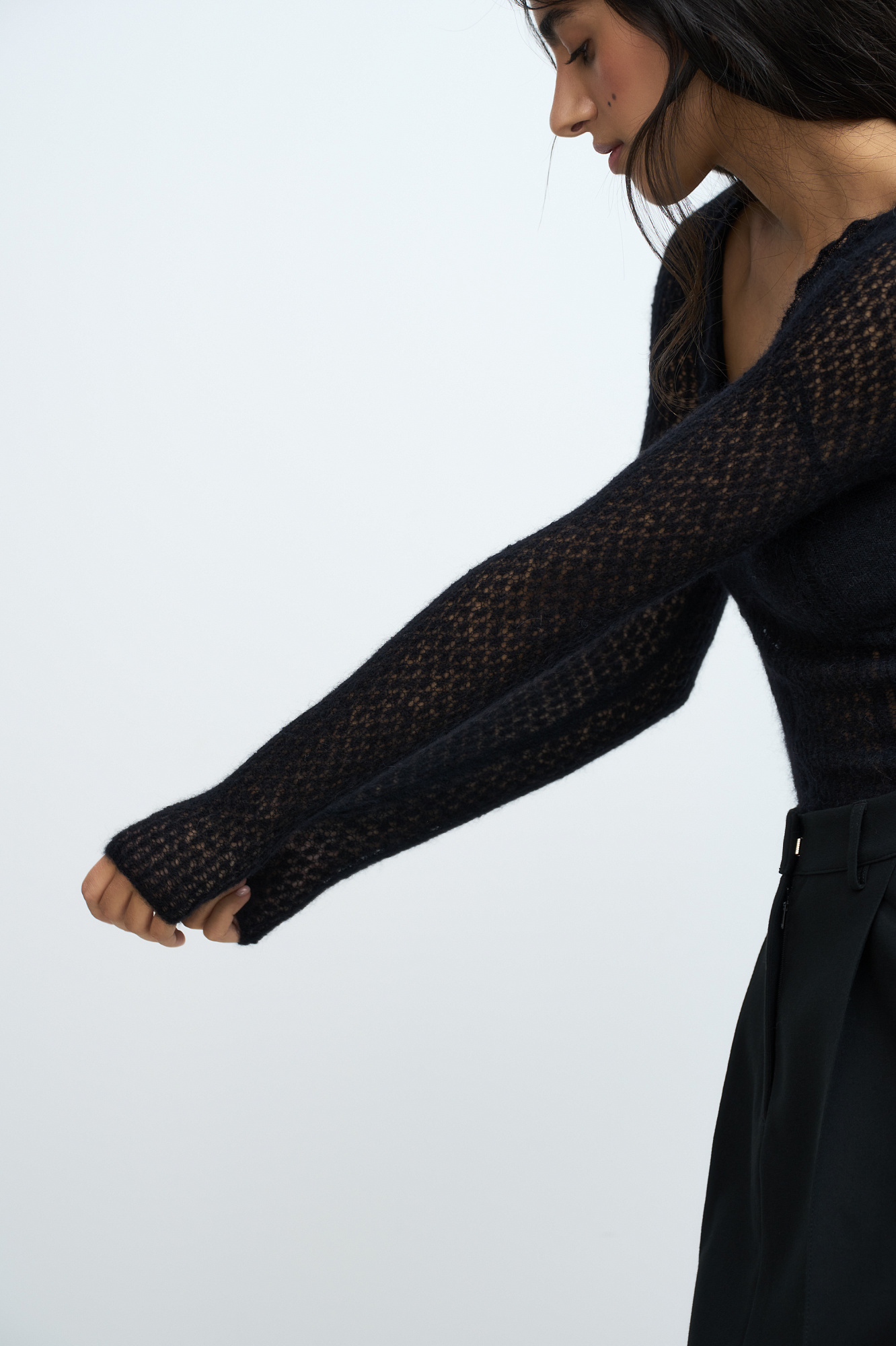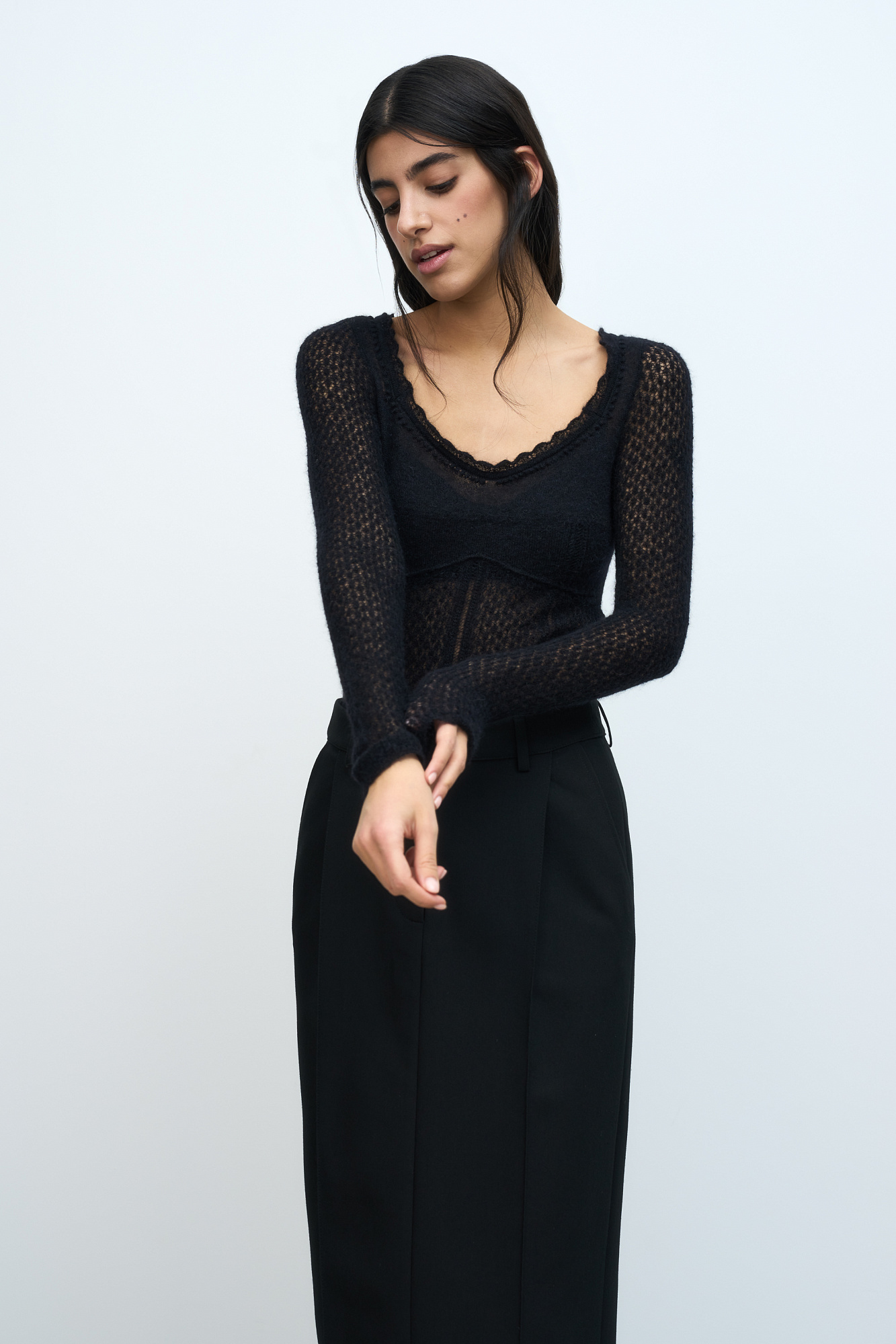тонкий ажурный джемпер из супер кид мохера и шерсти беби альпака. Модель приталенного силуэта, с глубоким вывязаным декольте и длинными рукавами.