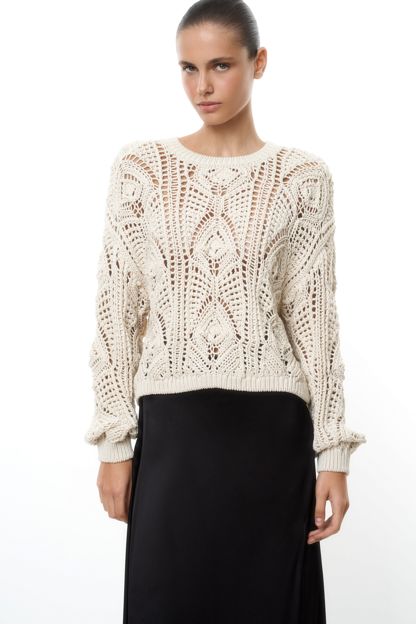 Трикотажный джемпер из хлопка, выполненный ажурной вязкой с орнаментом. Модель свободного силуэта с длинными рукавами и круглым вырезом горловины. Манжеты и низ изделия выполнены в рубчик.