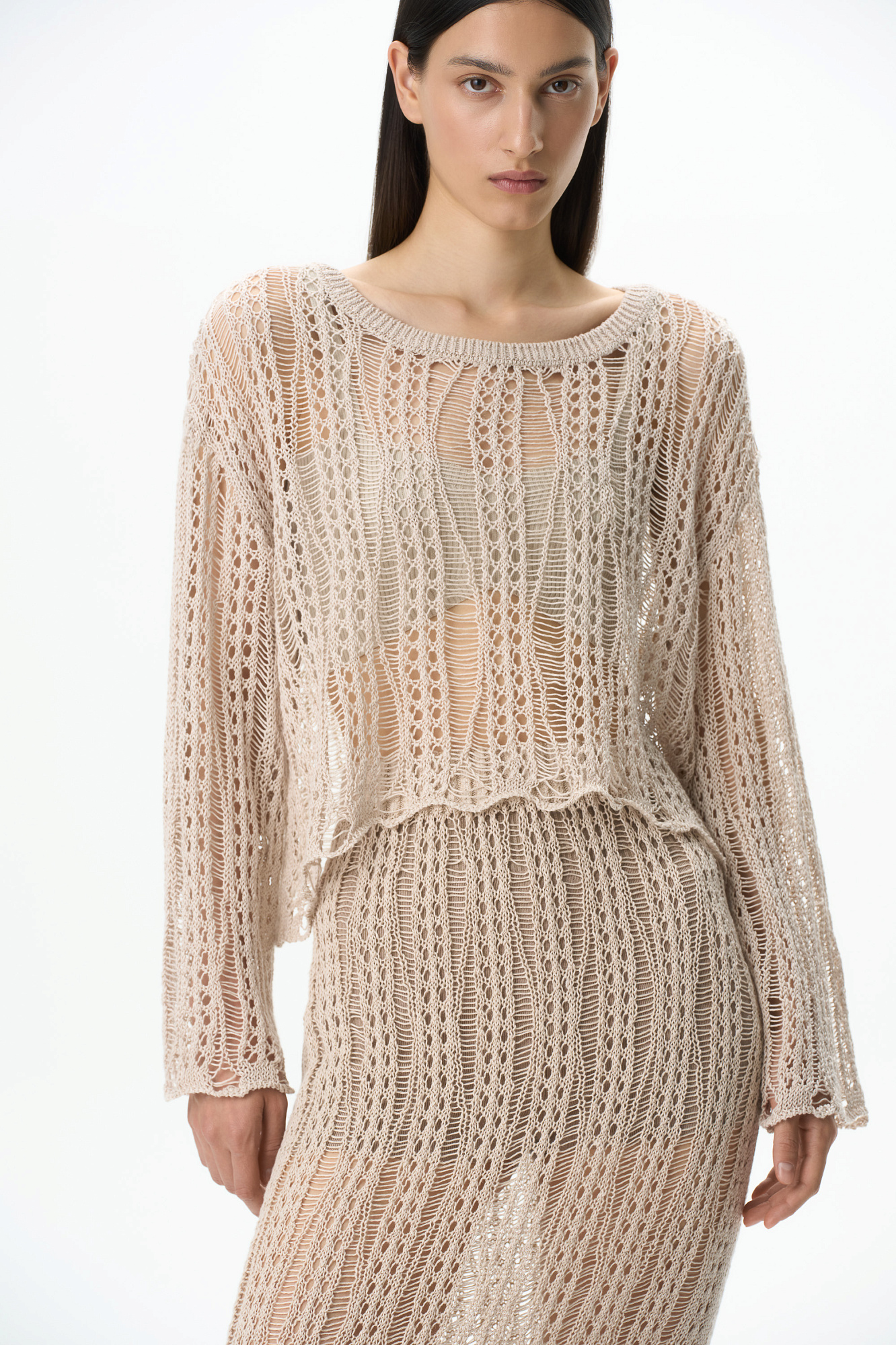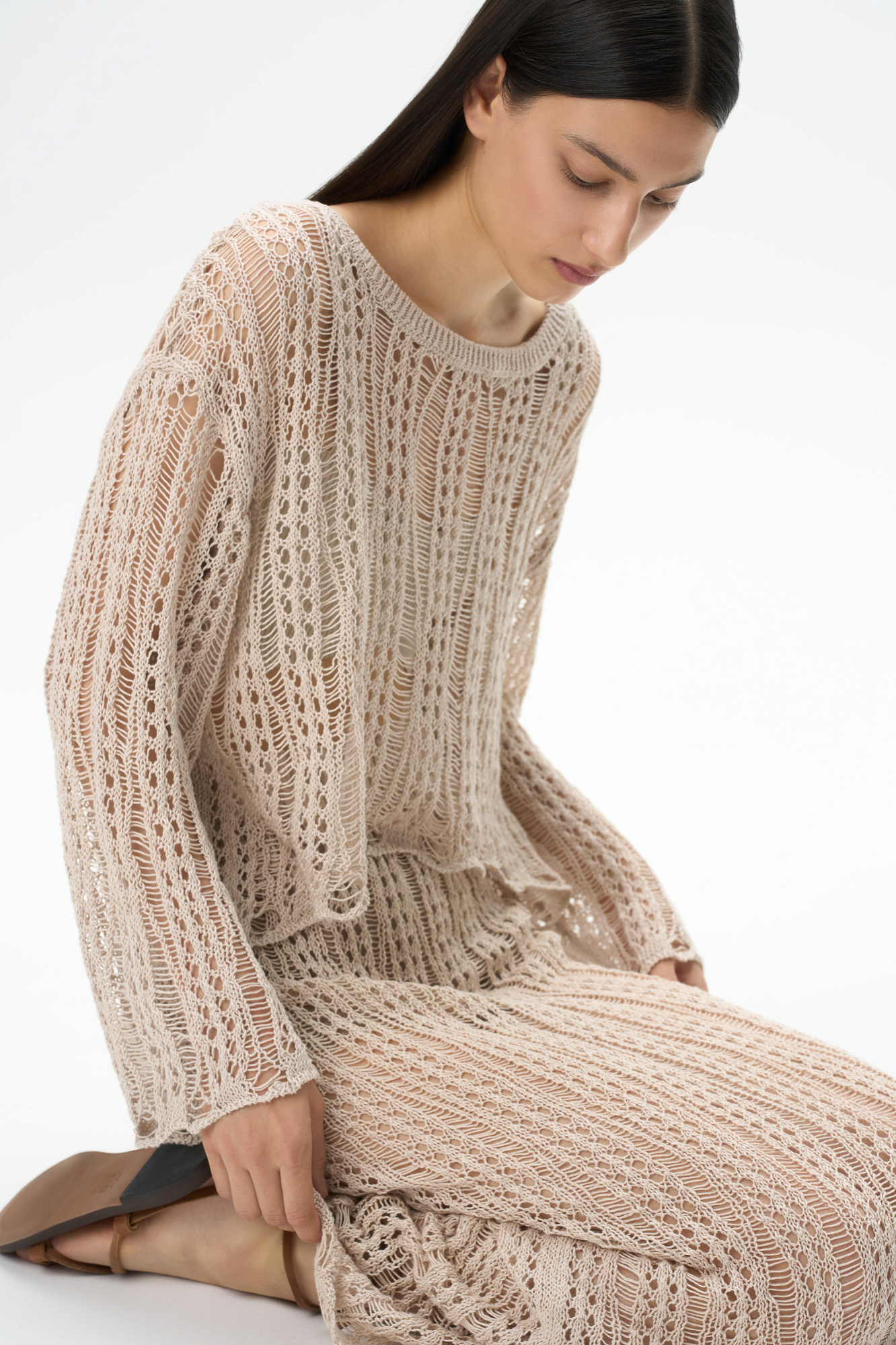 Полупрозрачный ажурный джемпер. Модель свободного силуэта со спущенной линией плеча. Дополнить образ можно юбкой в таком же стиле.