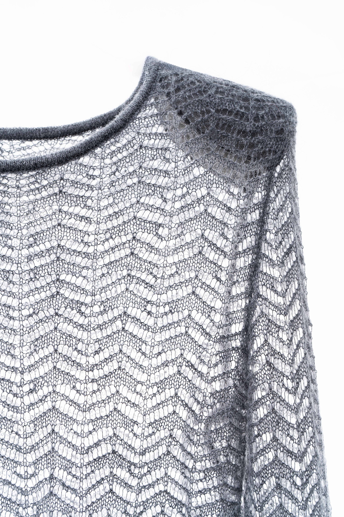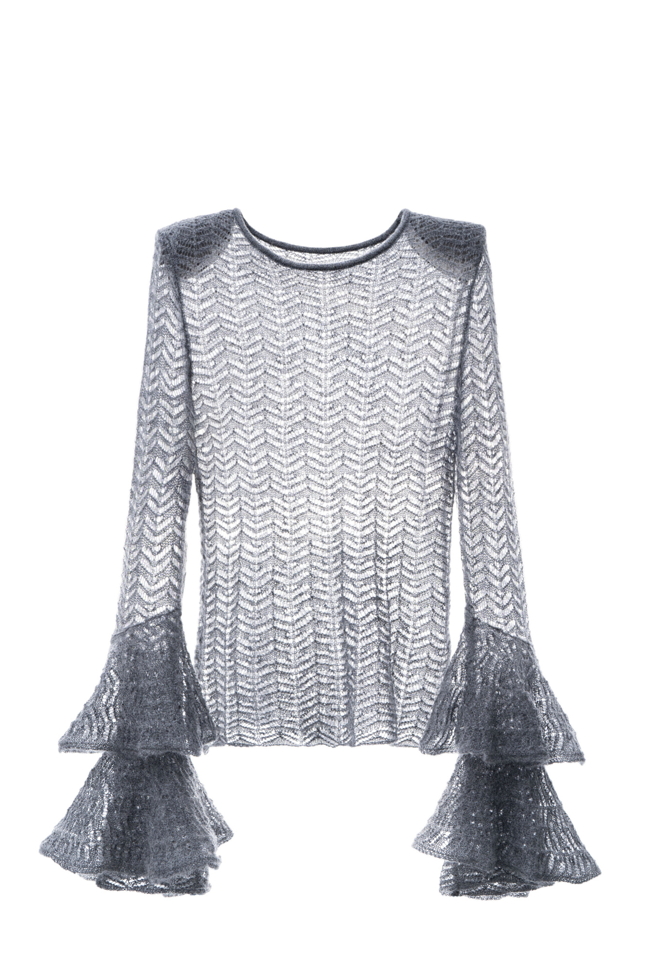 Трикотажный ажурный джемпер из шерсти с добавлением мохера. Модель по фигуре с круглым неглубоким вырезом горловины и подплечниками. Изделие декорировано ажурными воланами на манжетах.