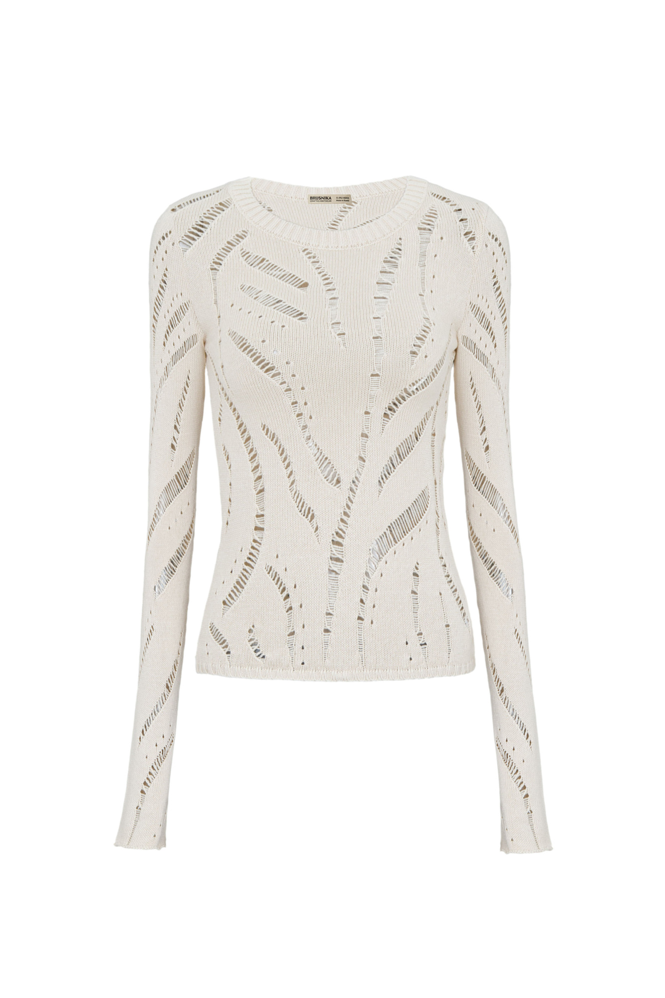 Трикотажный джемпер из 100% хлопка. Длинные расклешенные рукава, круглый вырез в рубчик. Модель фактурной вязки с протяжками.