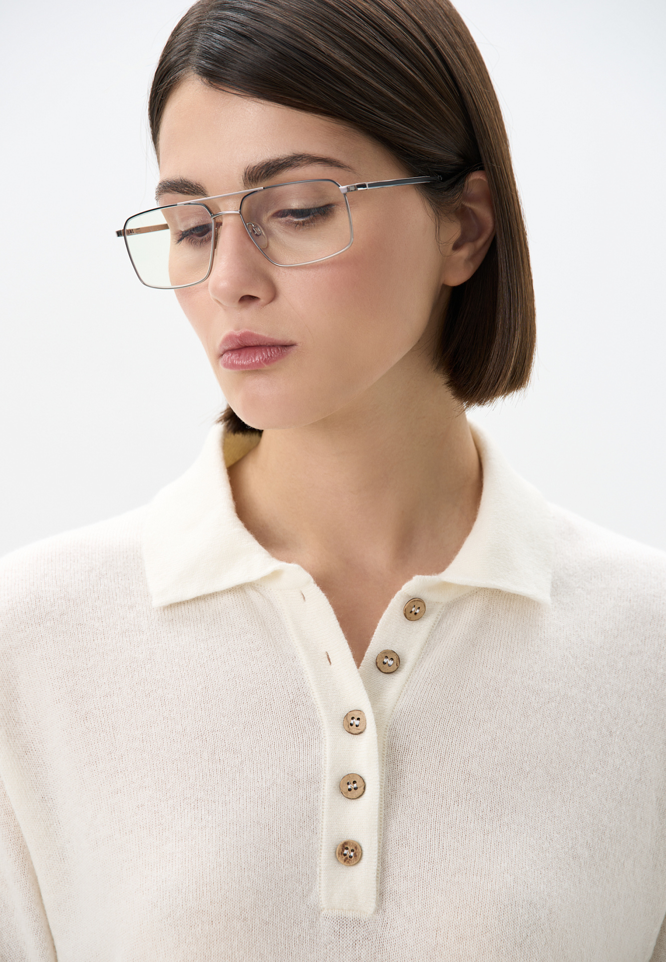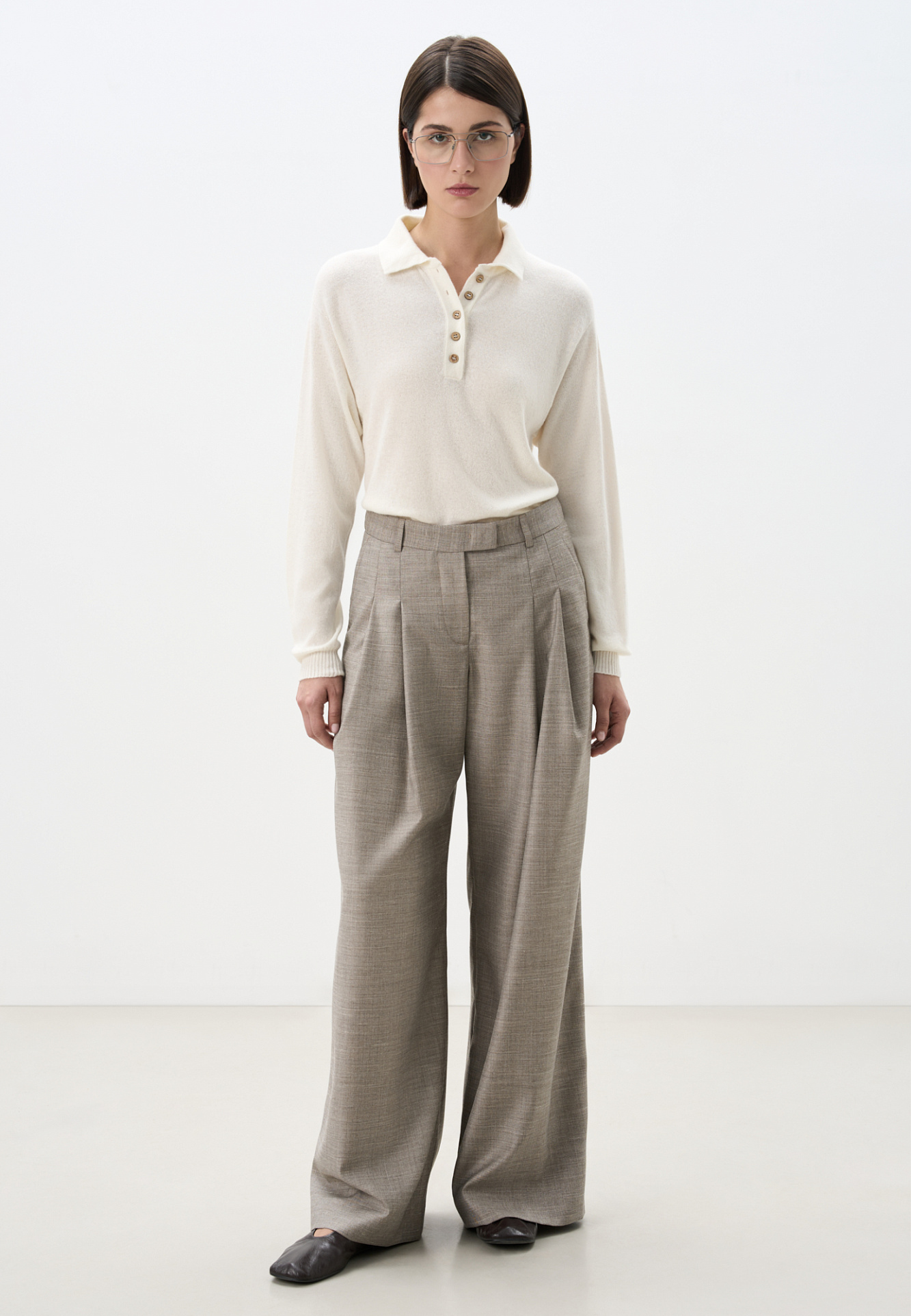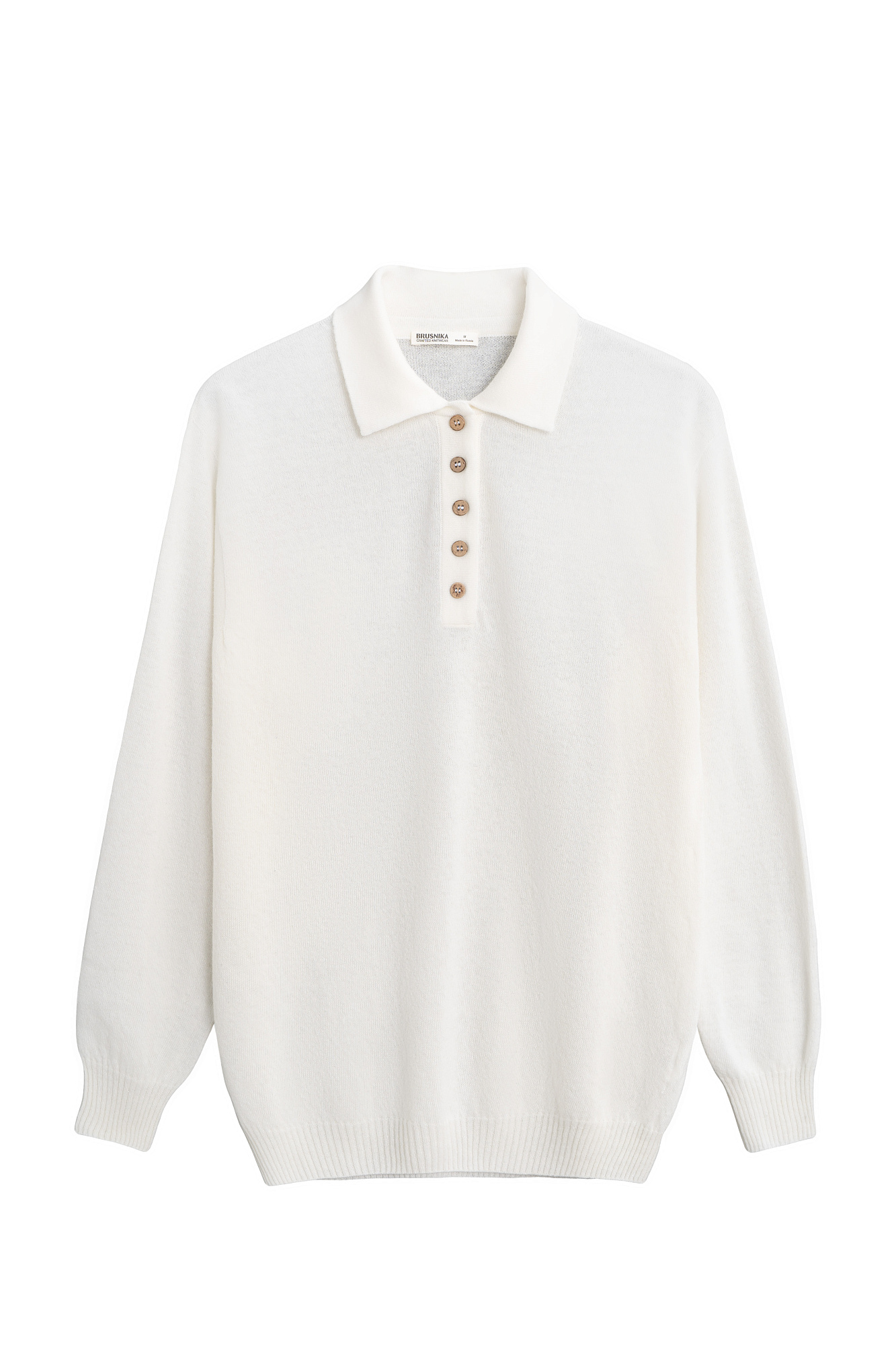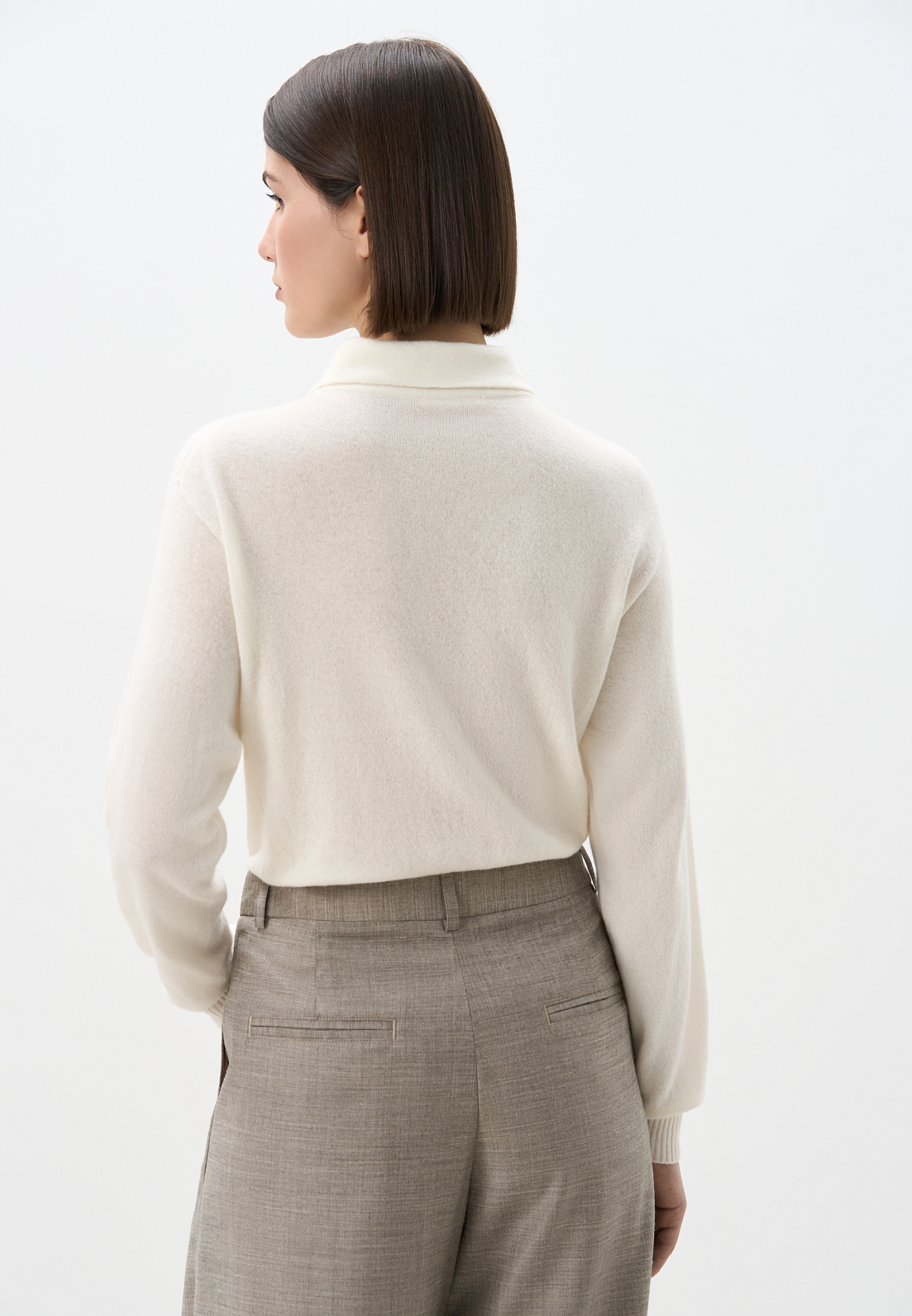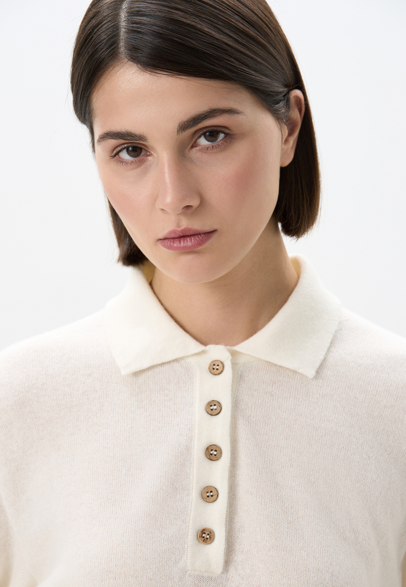 Трикотажный джемпер из кашемира и шерсти. Модель прямого силуэта со спущенной линией плеча и воротником поло на пуговицах. Манжеты рукавов и низ изделия выполнен в рубчик.