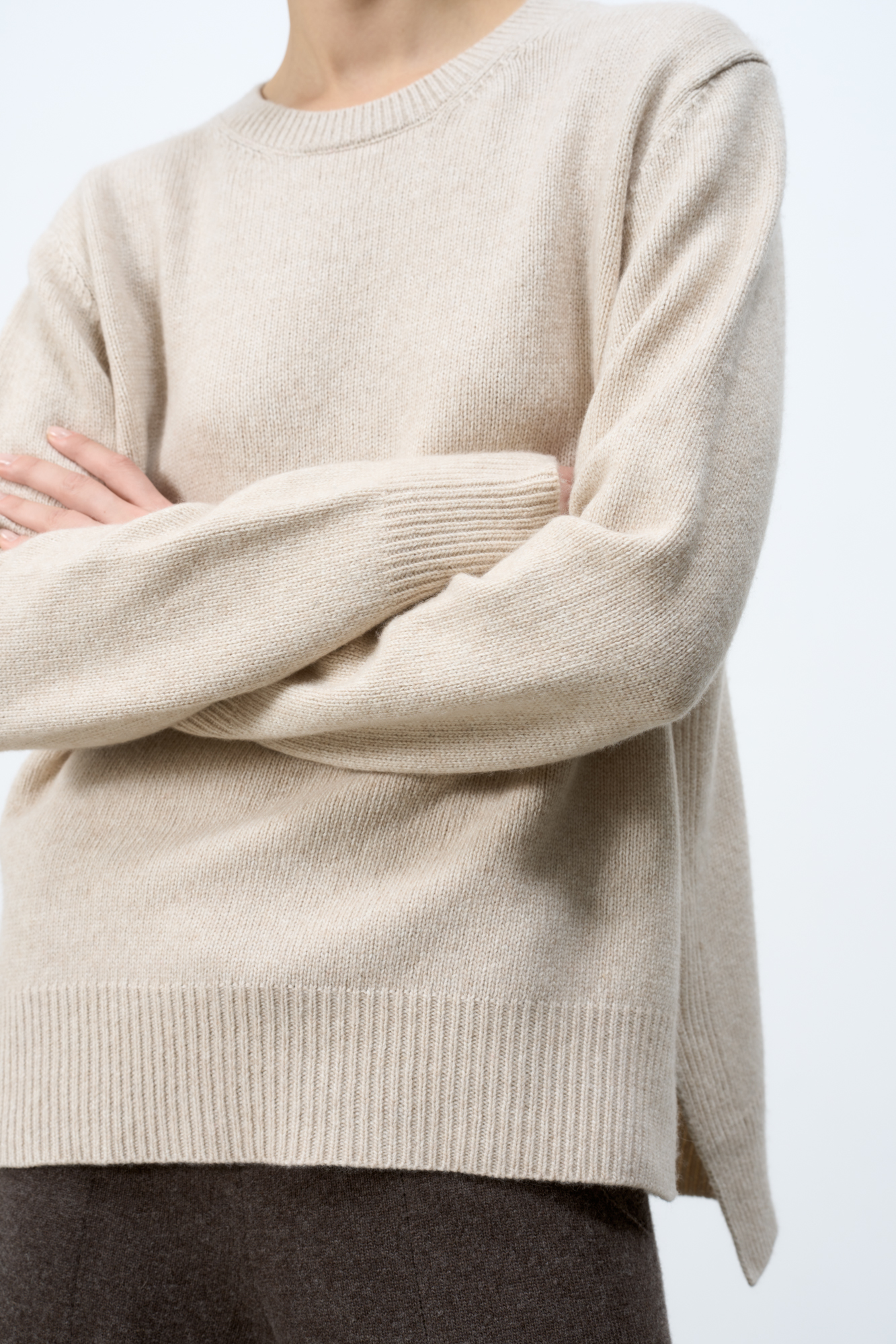 Трикотажный джемпер из кашемира и шерсти. Модель свободного силуэта с удлиненной спинкой и разрезами по бокам. Манжеты рукавов и низ изделия выполнены в рубчик.