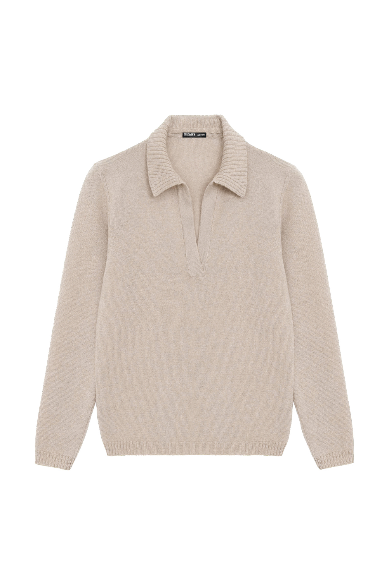 Трикотажный джемпер с воротником-поло из 100% кашемира. Модель свободного силуэта, края изделия выполнены в рубчик.