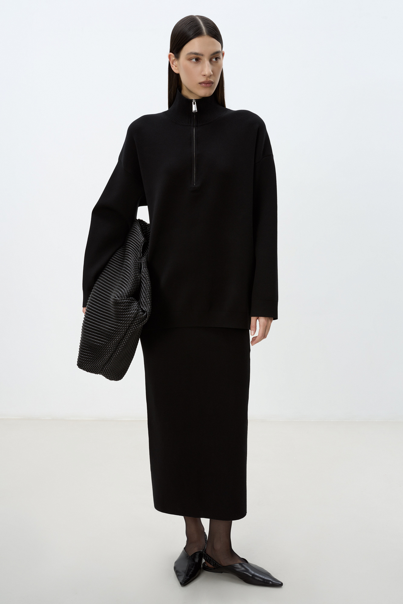Трикотажный джемпер из вискозы с воротником-стойкой. Модель свободного силуэта со спущенной линией плеча и застежкой на молнию. Манжеты рукавов, воротник и низ изделия выполнены в рубчик.