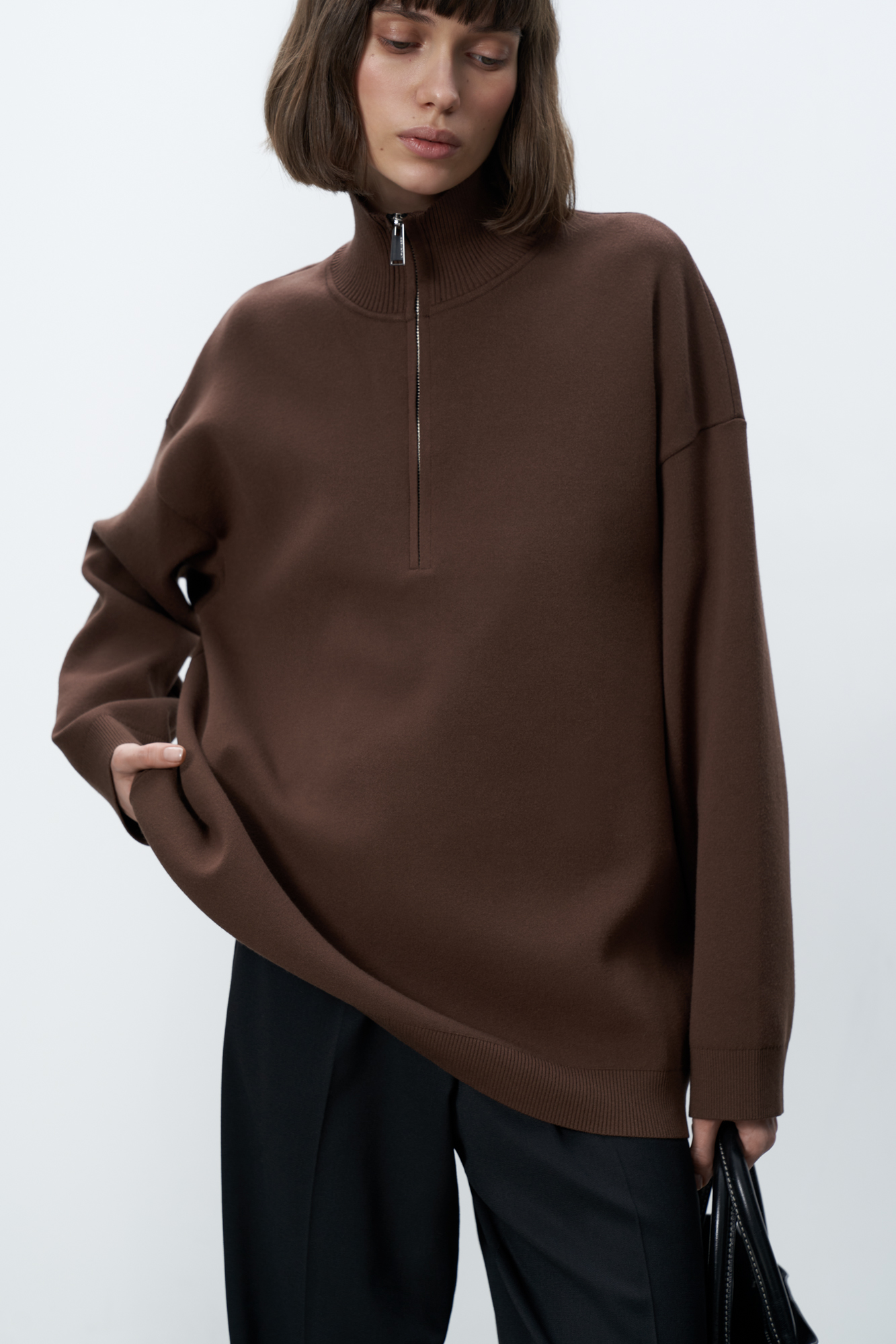 Трикотажный джемпер из вискозы с воротником-стойкой. Модель свободного силуэта со спущенной линией плеча и застежкой на молнию. Манжеты рукавов, воротник и низ изделия выполнены в рубчик.