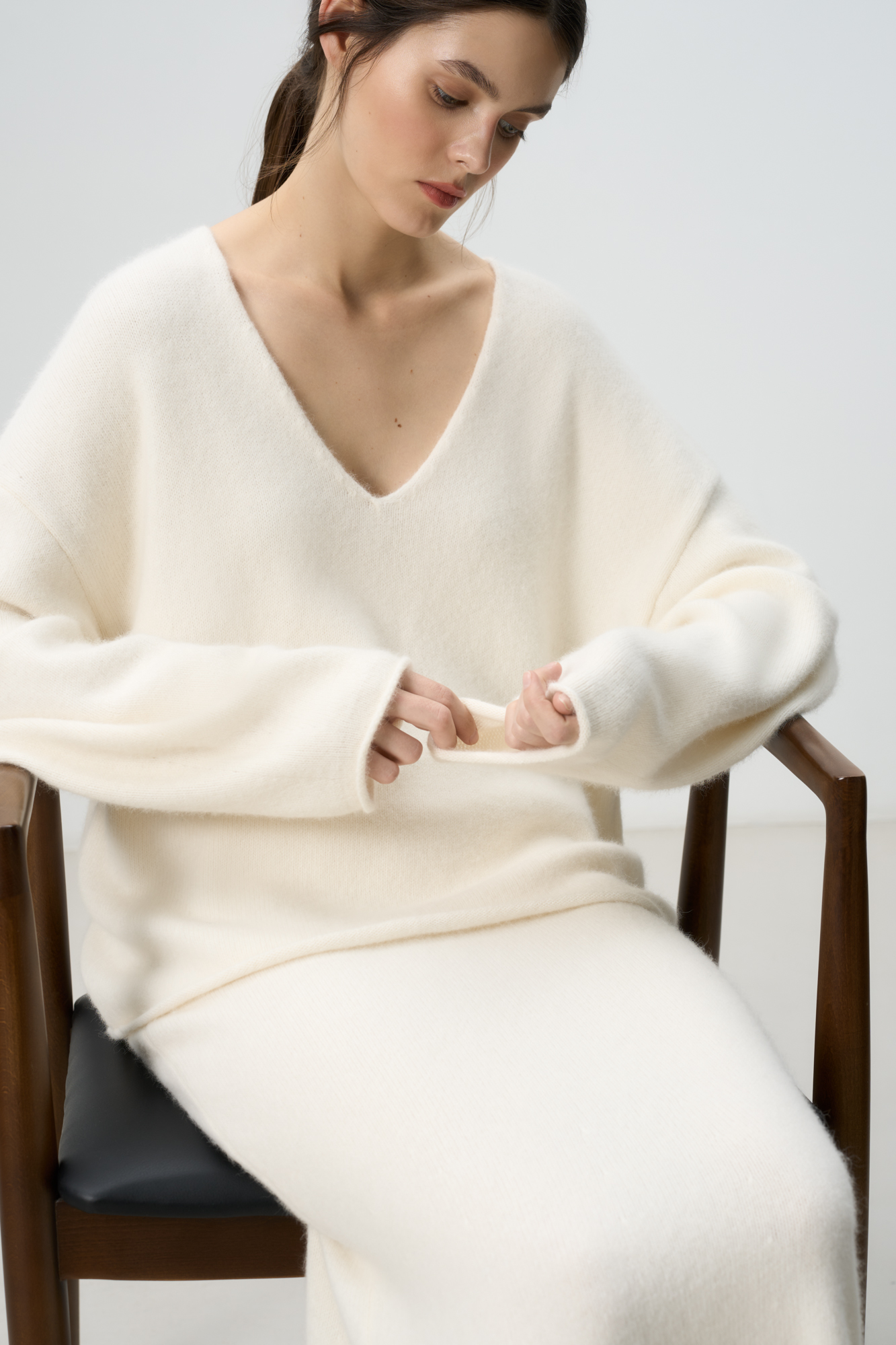 Объемный трикотажный джемпер из пуха лисы. Модель с глубоким V-образным вырезом горловины, спущенной линией плеч, длинными широкими рукавами и валиками по низу. Дополнить образ можно юбкой.