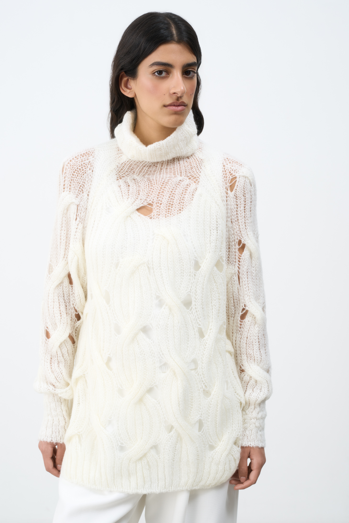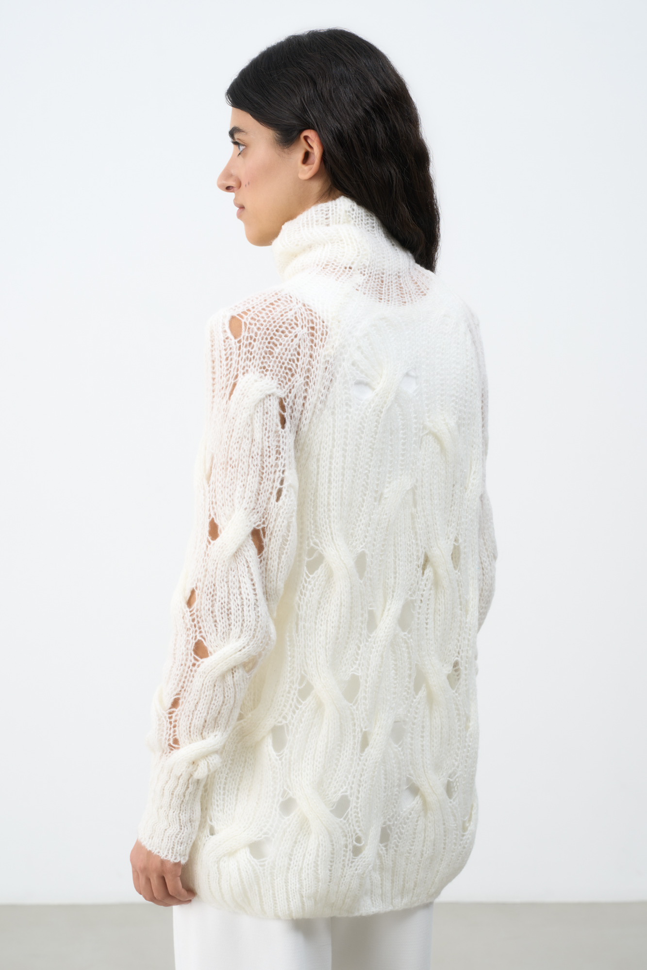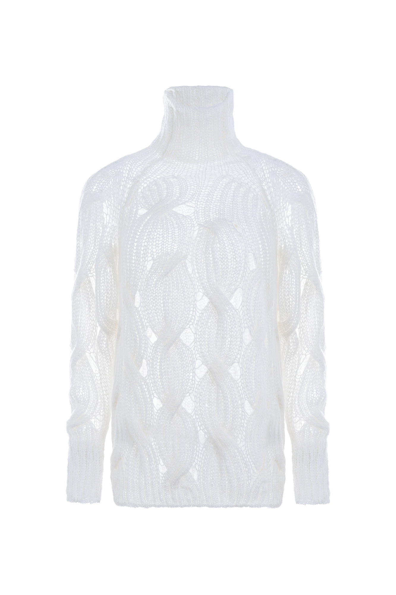 Объемный удлиненный джемпер с мохером, вязка выполнена крупными косами. Высокий ворот под горло. Манжеты рукавов и низ изделия на резинке.