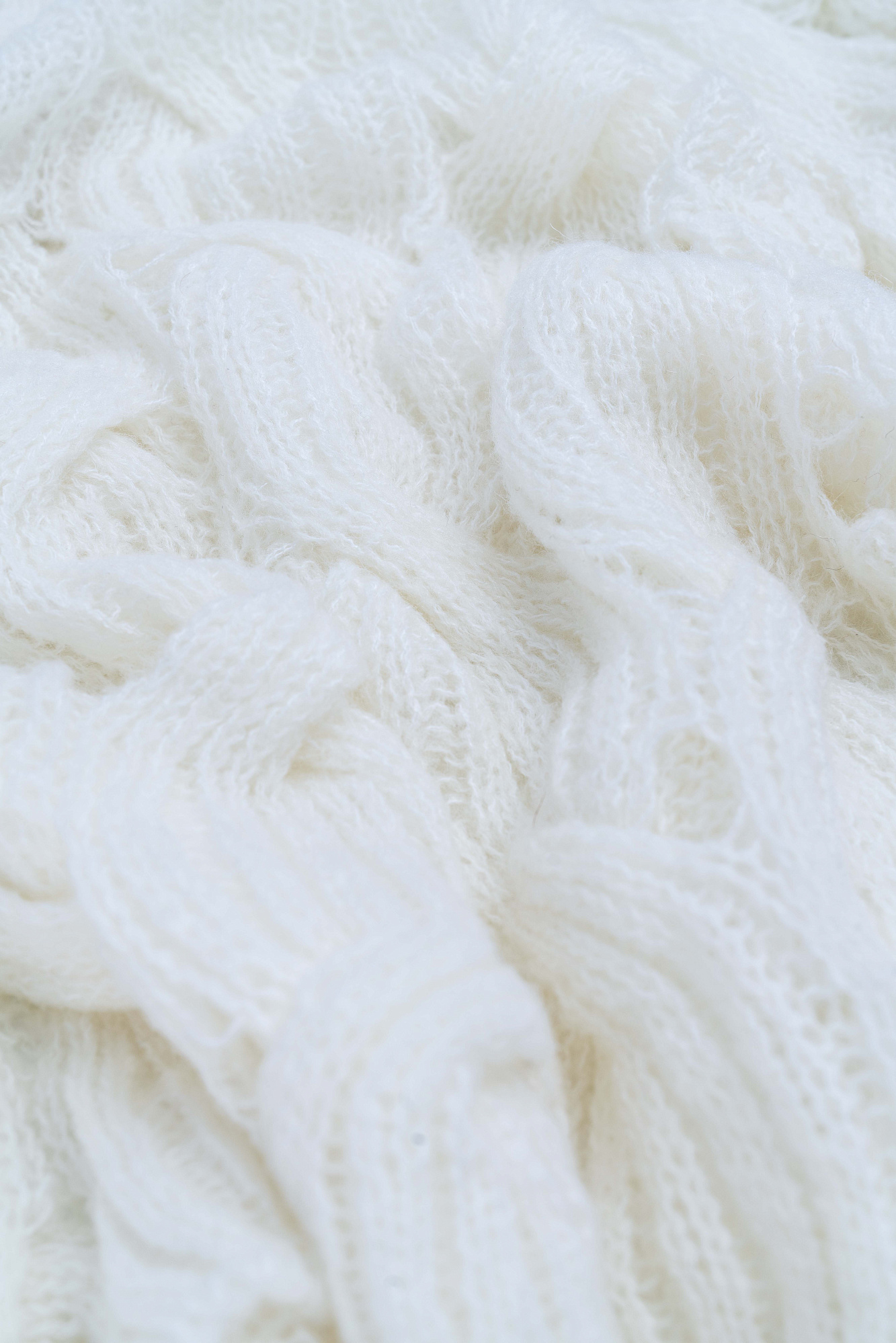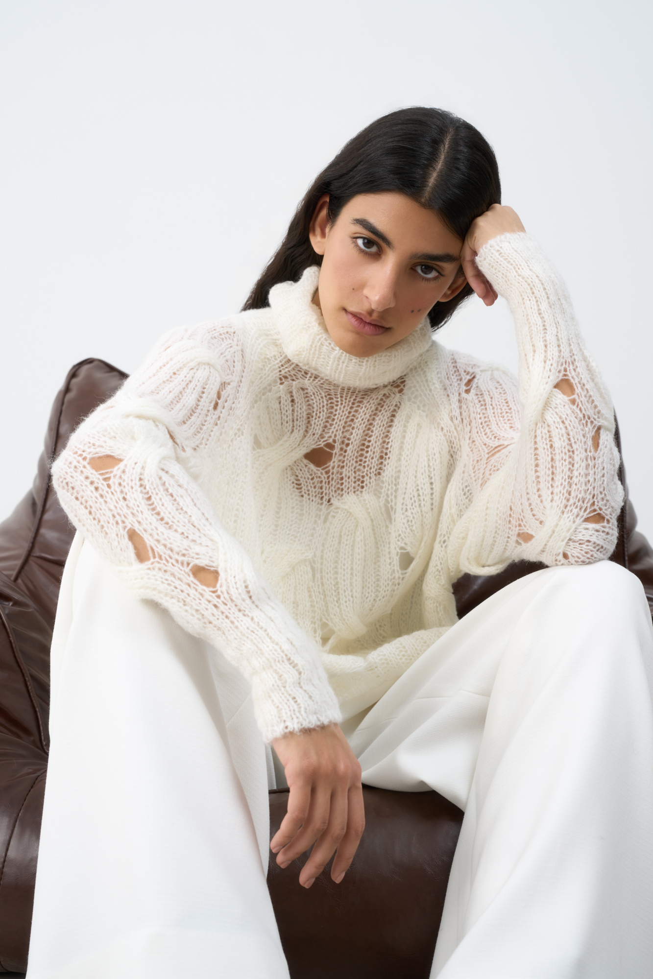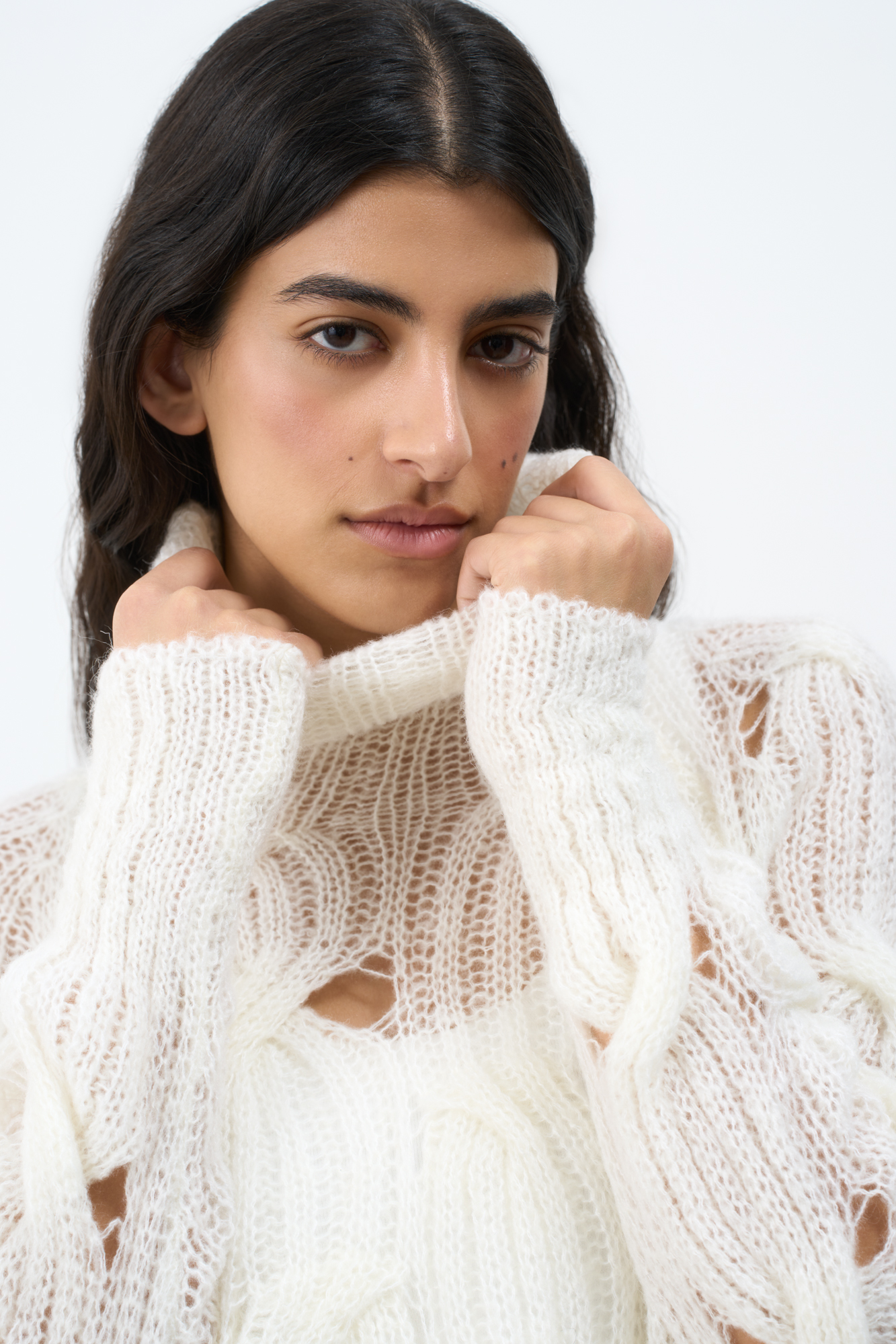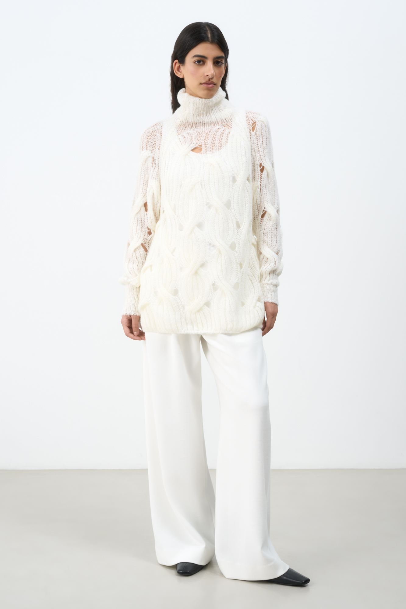 Объемный удлиненный джемпер с мохером, вязка выполнена крупными косами. Высокий ворот под горло. Манжеты рукавов и низ изделия на резинке.