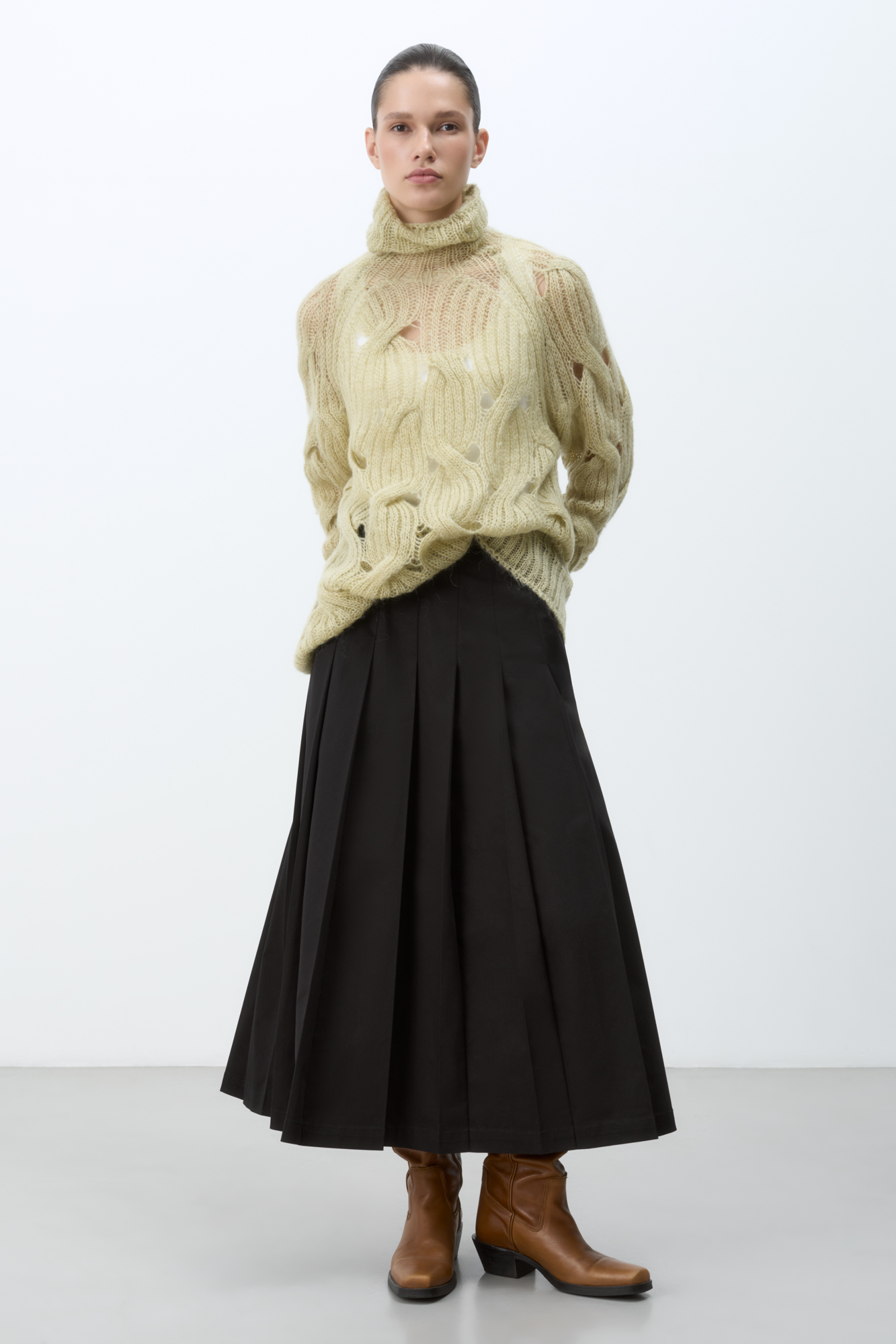 Объемный удлиненный джемпер с мохером, вязка выполнена крупными косами. Высокий ворот под горло. Манжеты рукавов и низ изделия на резинке.