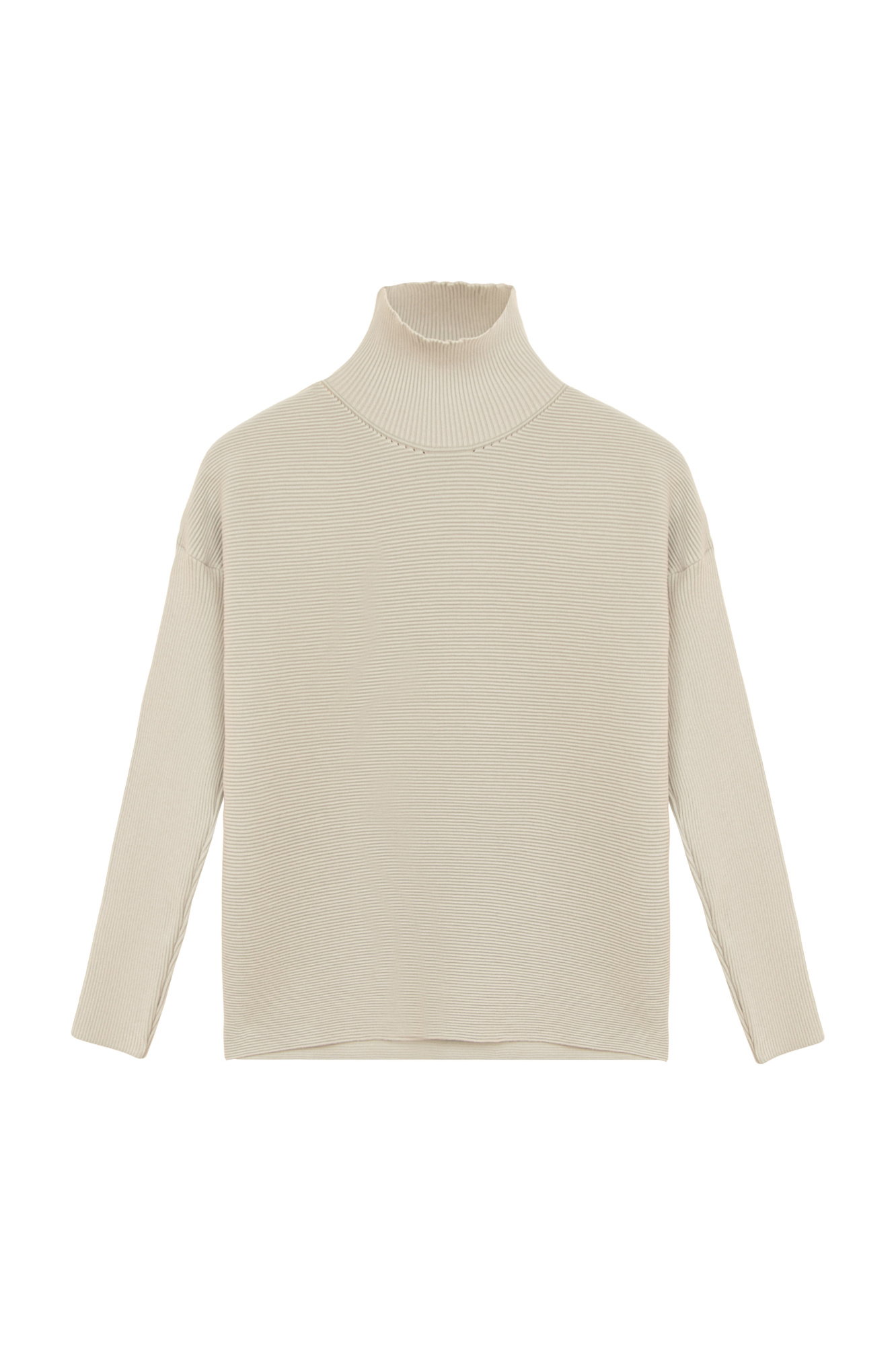 Трикотажный джемпер из вискозы в мелкий валик. Модель с длинным рукавом и воротником-стойкой.