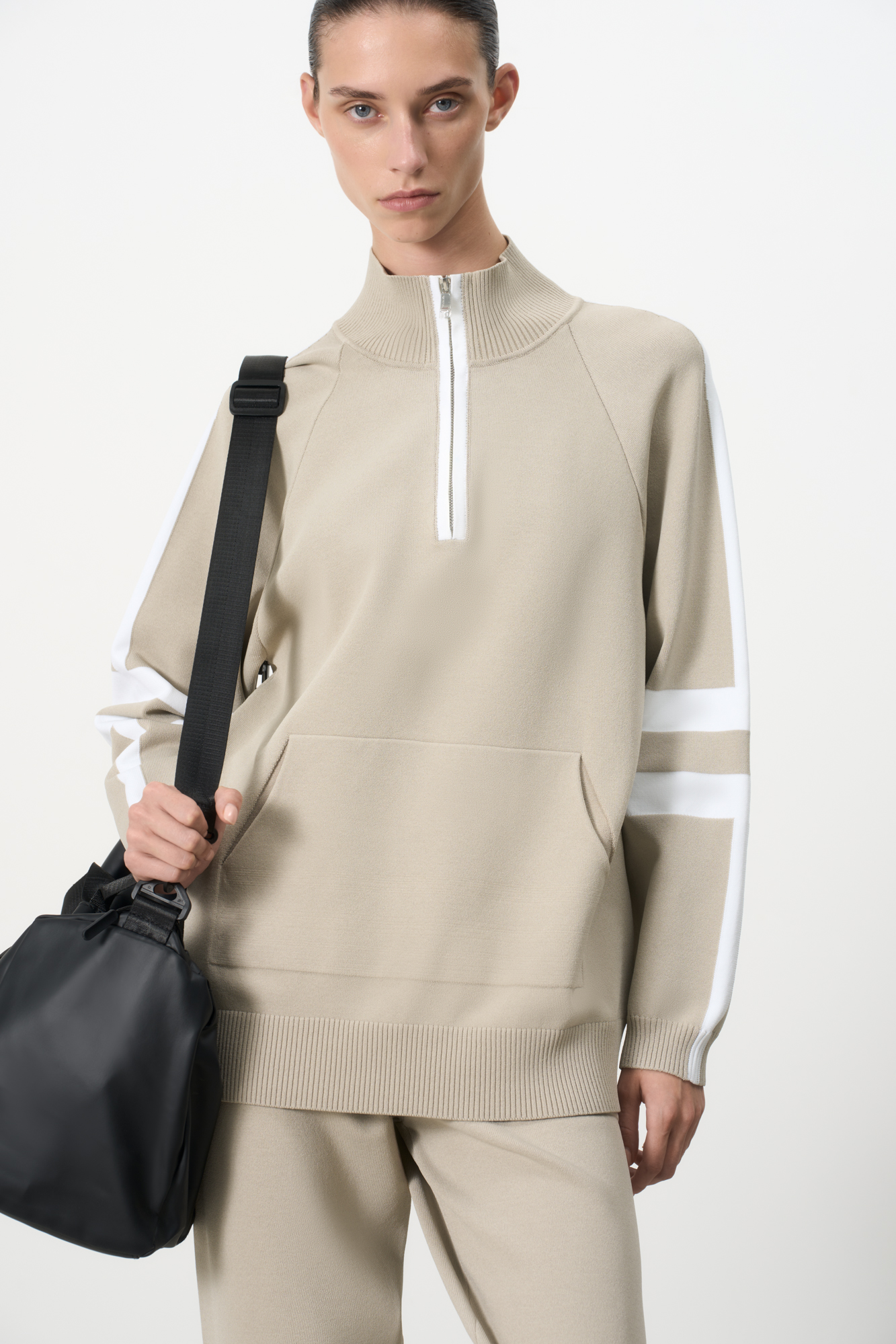 Джемпер из вискозы в спортивном стиле. Лампасы на рукавах. Высокий воротник. Застежка-молния.