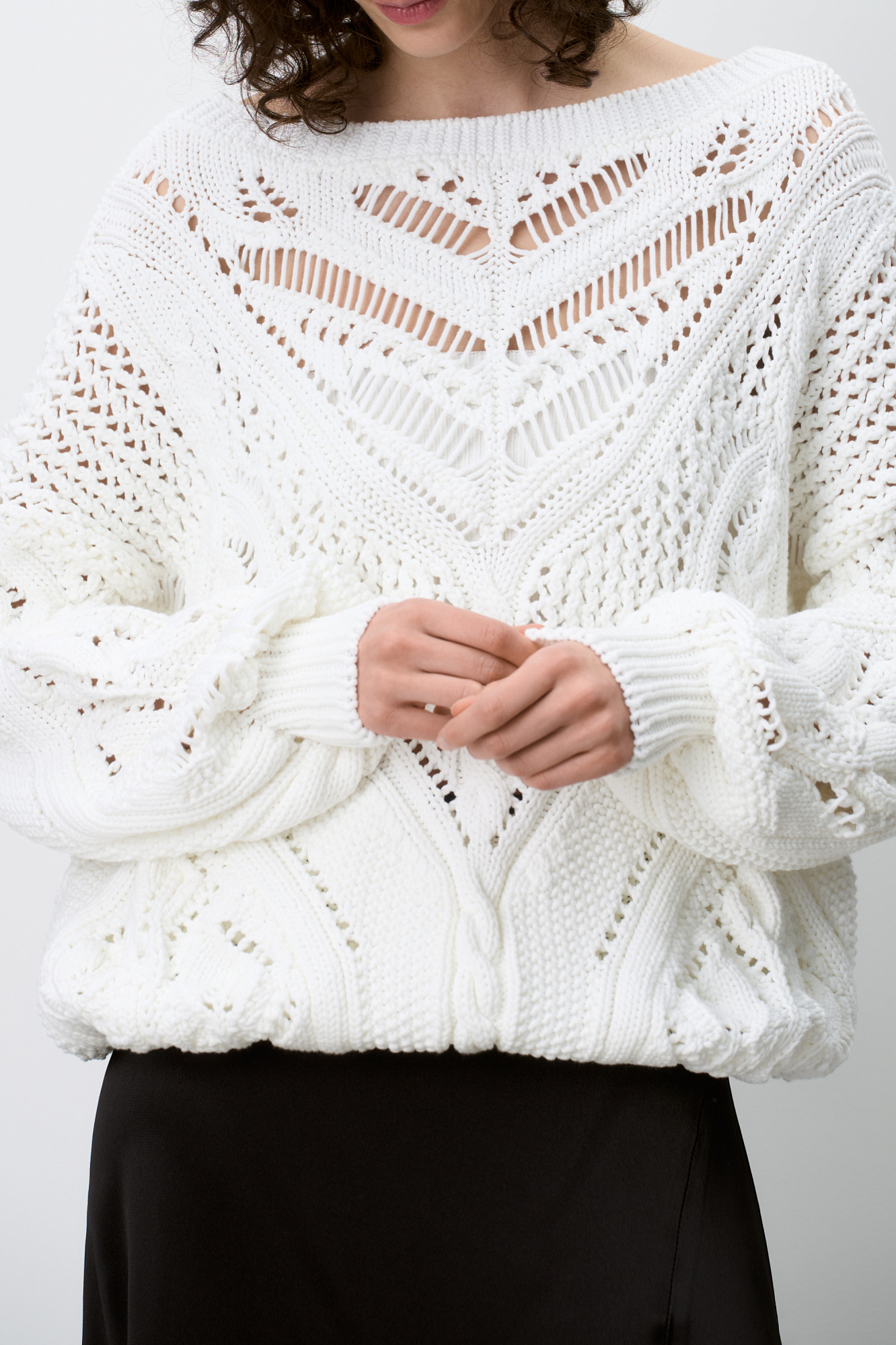 Ажурный джемпер из хлопка с V-образным вырезом. Свободная посадка, длинный рукав с манжетами. Джемпер станет прекрасным дополнением к брюкам и к юбке, а фасон позволяет носить джемпер как вырезом на груди, так и на спине.