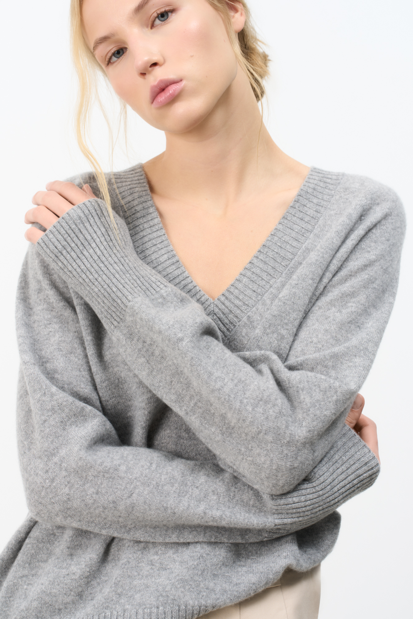 Джемпер с V-образным вырезом из 100% кашемира. Модель свободного силуэта со спущенной линией плеча. Края изделия в рубчик.